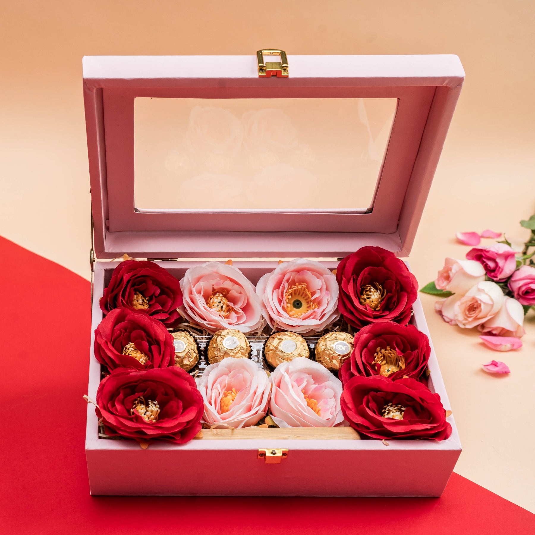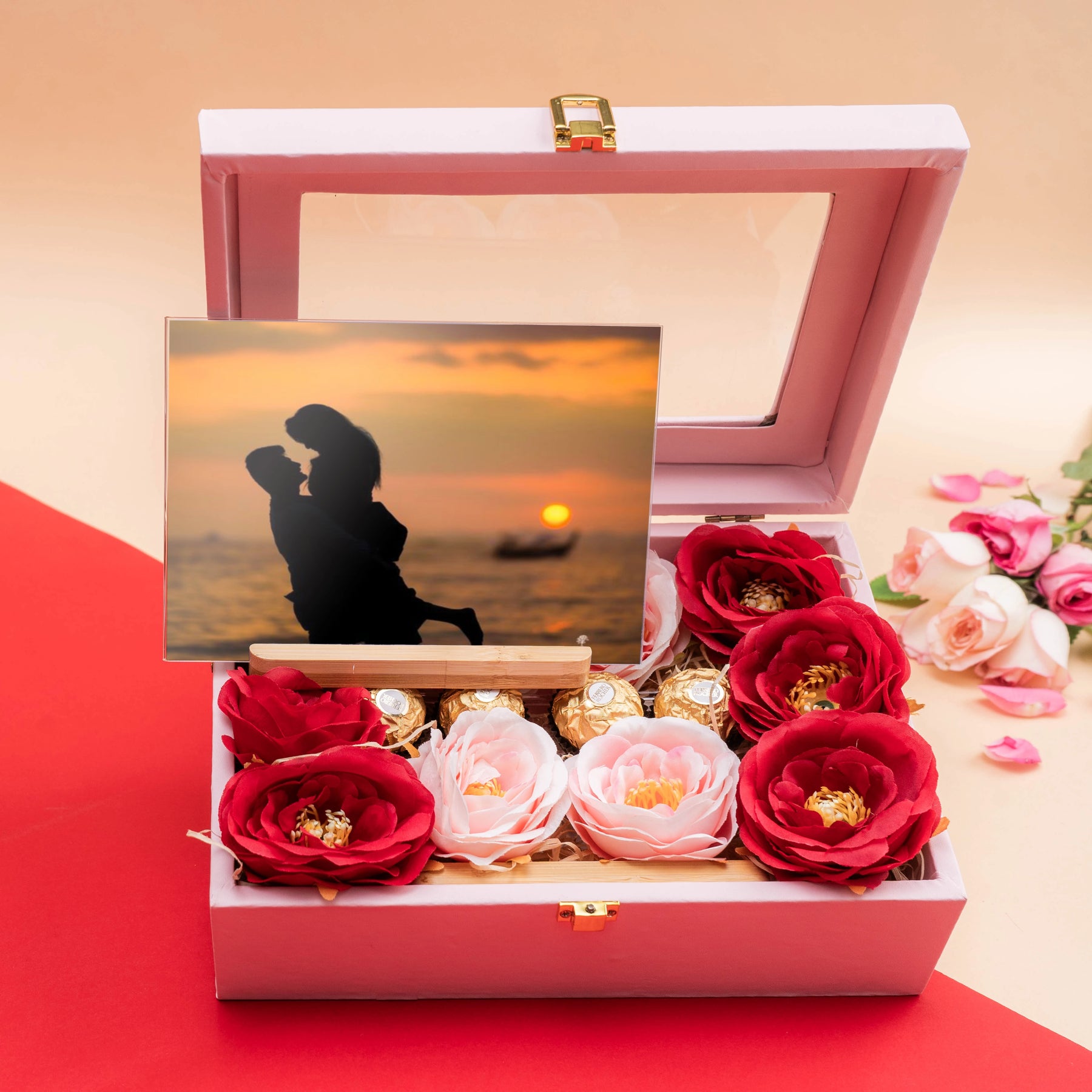 Show your affection beautifully with the Sweet Treasures Gift Hamper from The Zappy Box. Featuring a set of premium Ferrero Rocher chocolates, a stylish wooden photo frame, and a charming set of decorative flowers, this hamper is perfect for making moments memorable. The addition of a personalized greeting card and reusable Zappy Gift Box completes this thoughtful gift, ideal for birthdays, anniversaries, or heartfelt occasions. Celebrate joy, love, and sweetness wrapped in an elegant presentation.