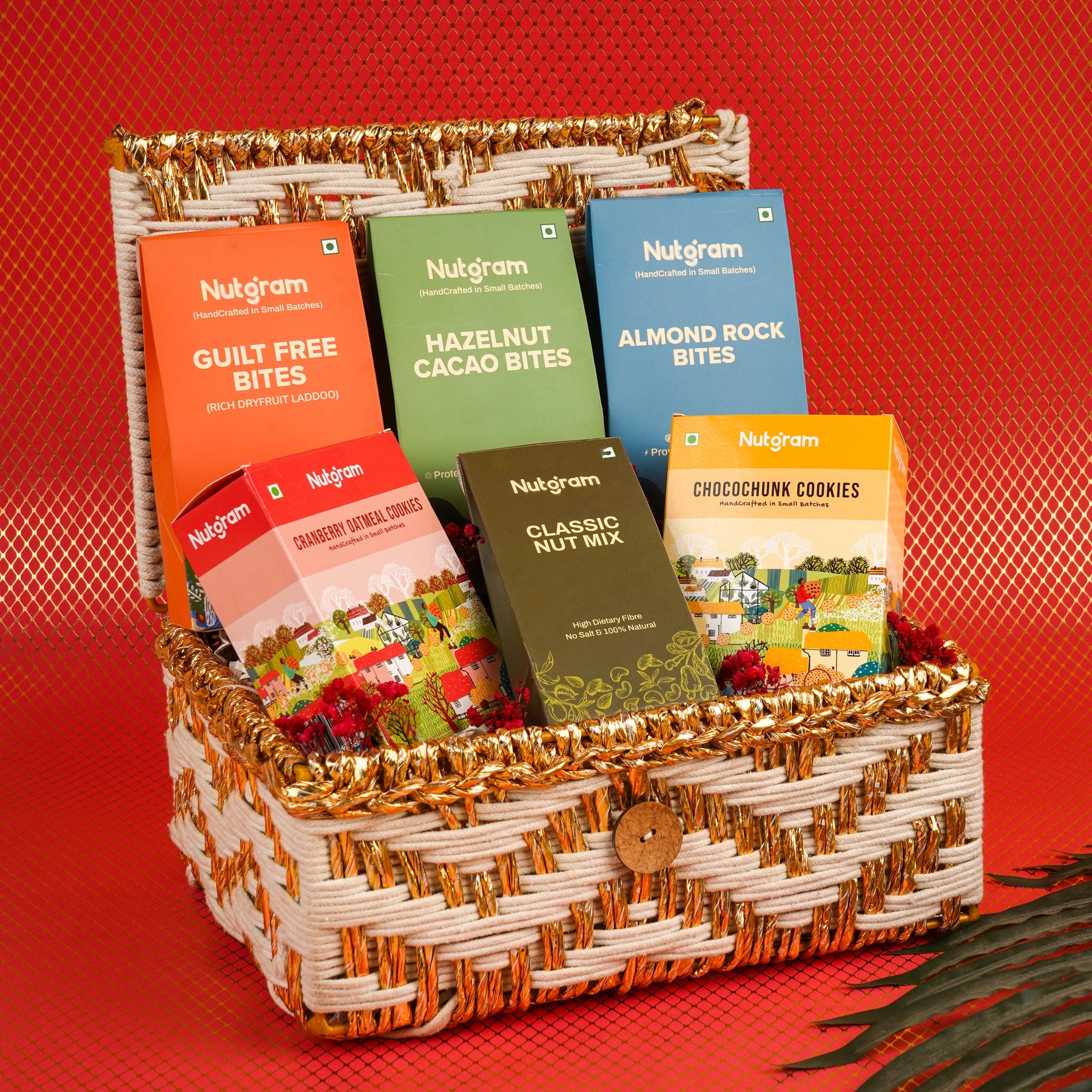 Celebrate mindful indulgence with the Nutty Delights Chocolate & Nut Treats Gift Basket, a thoughtfully curated chocolate snack gift basket filled with cocoa-rich bites, crunchy nuts, and wholesome cookies. Featuring Nutgram’s small-batch treats, this hamper brings together indulgent chocolate flavours alongside nourishing nut snacks for a balanced and satisfying treat.