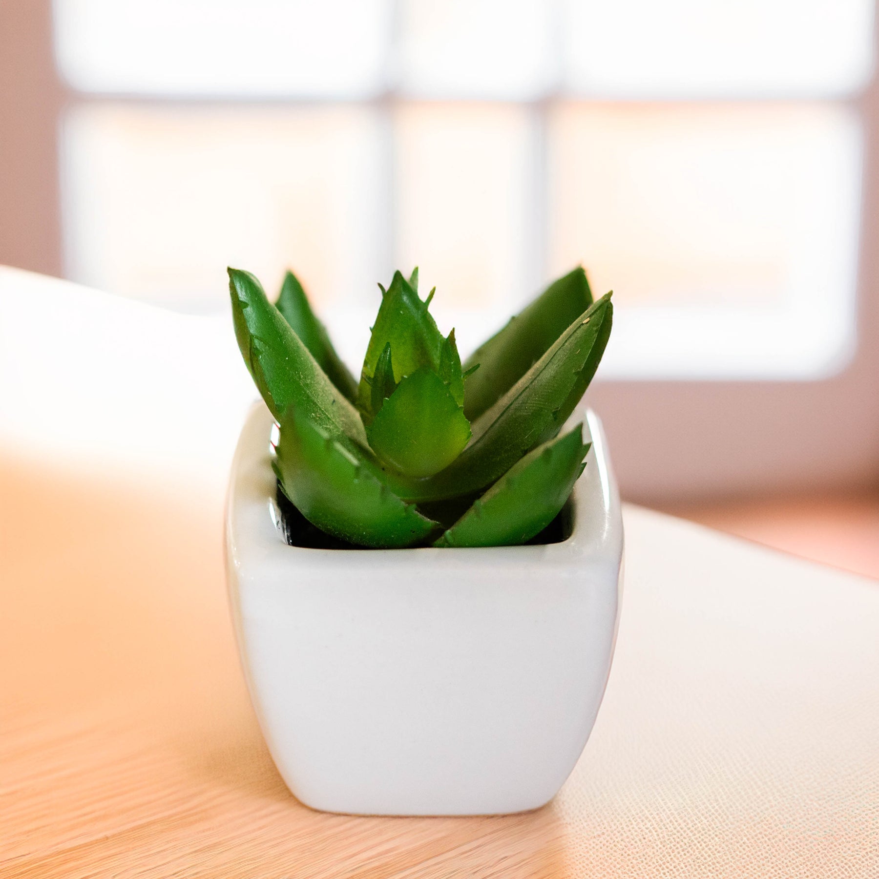 Brighten up any space effortlessly with our Mini Artificial Succulent Plant, a charming addition to modern home or office décor. Designed to mimic the look of real greenery, this compact plant delivers all the aesthetic appeal of a live succulent without the hassle of watering or upkeep. Made from durable, high-quality plastic, it sits in a contemporary pot that complements any interior style, especially modern and minimalistic setups. Measuring approximately 5 x 5 x 7.5 cm, its small footprint makes it ideal for desks, shelves, workspaces, or as a refreshing touch to gift hampers.