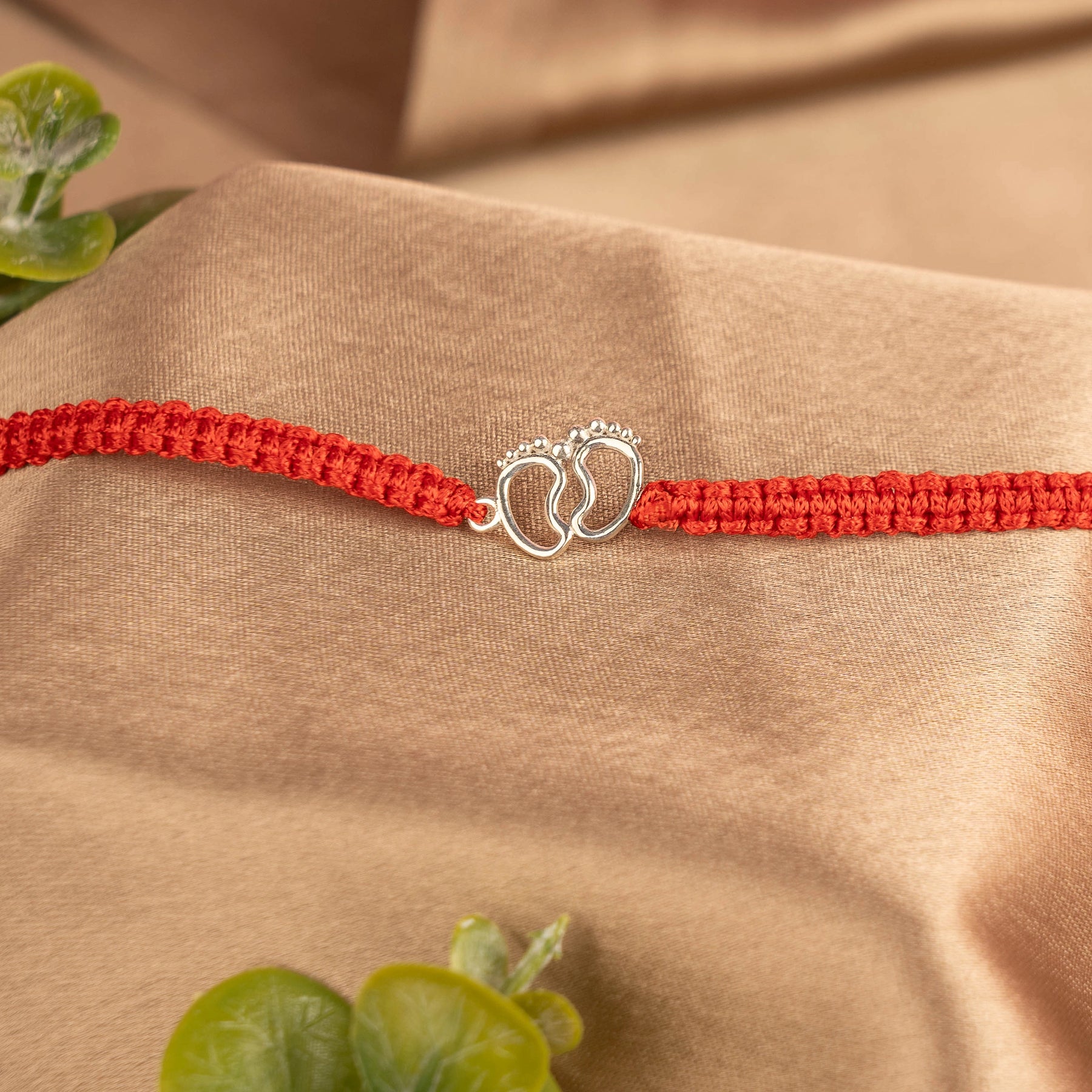 The Baby Footprint 925 Silver Rakhi comes in a cute and sentimental style. It falls under the category of wrist accessory. The design represents a tiny baby footprint in a polished silver charm on soft thread, symbolic of love since childhood. It is ideal for gifting on Raksha Bandhan, Bhai Dooj, or for little brothers with a big heart and various other occasions. To increase longevity, we recommend storing it in a dry place and avoiding contact with water or perfumes. Additionally, it is made with premium 925 silver Rakhi with hallmark; graceful design meets gifting authenticity.