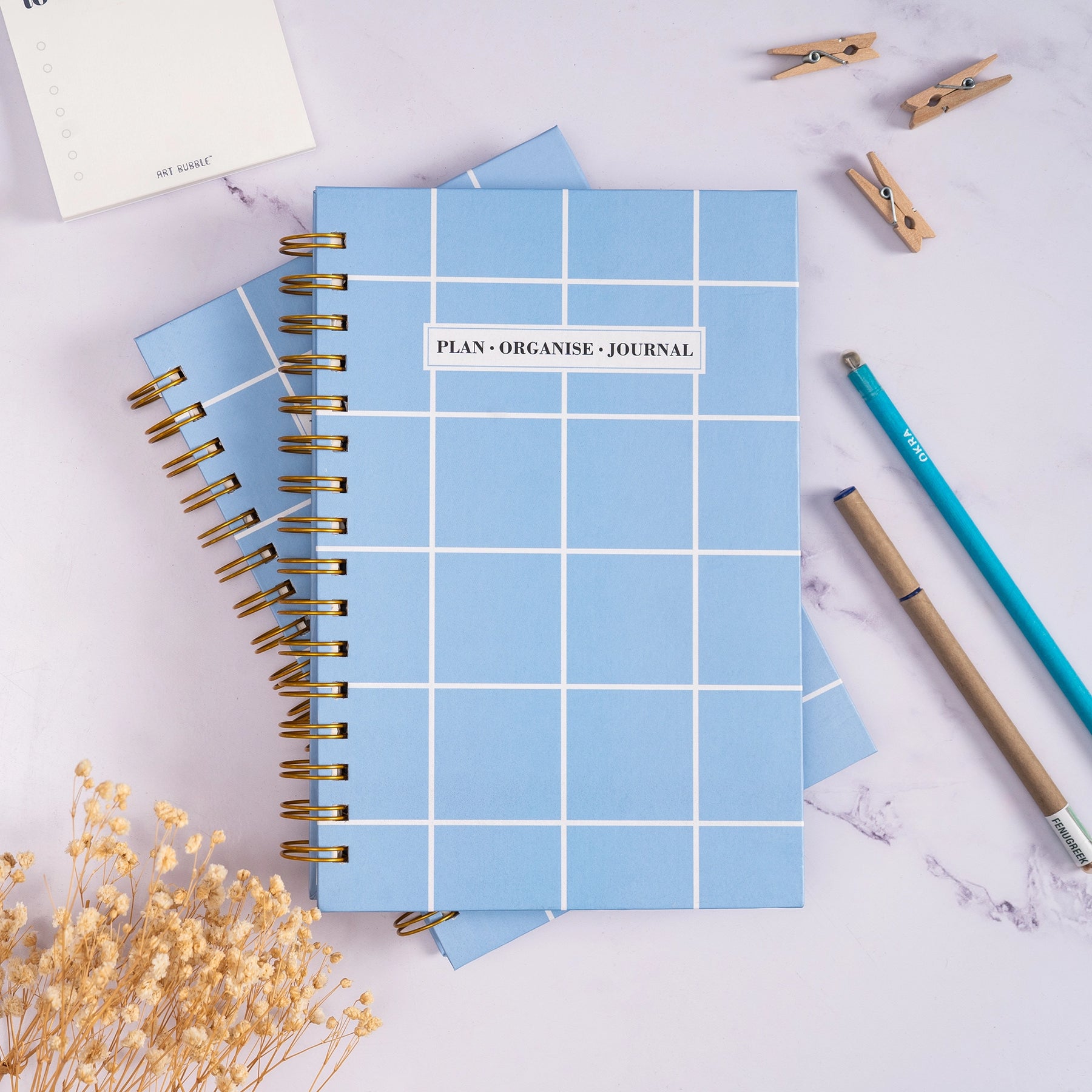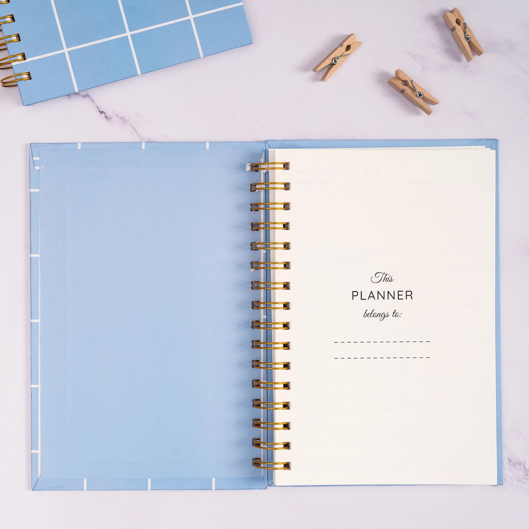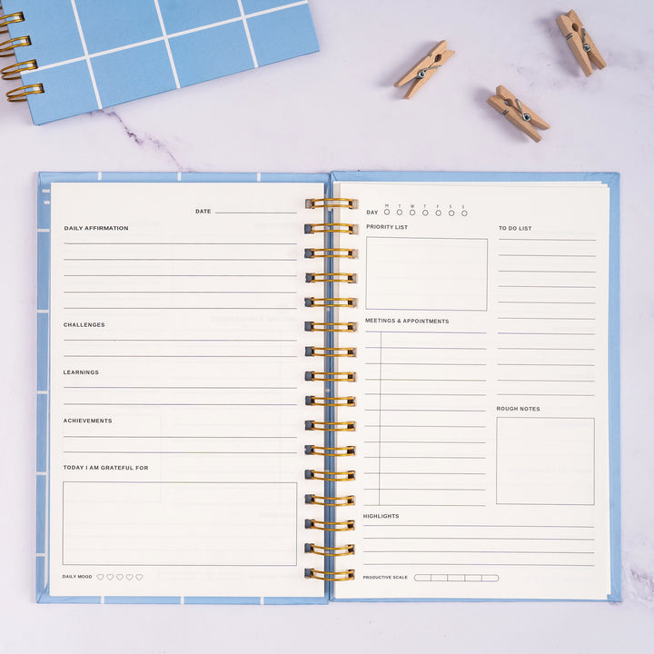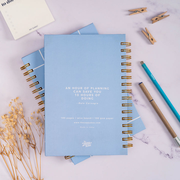 Start your day with clarity using the Zappy Box blue spiral-bound notebook. It is designed with a sleek, modern, minimal theme in mind, combining aesthetics and functionality. This daily schedule planner helps you capture thoughts, organize tasks, and reflect on the go. Our spiral-bound notebook fits perfectly into your routine, be it for travel or daily use. Make your daily needs scheduled and organized simpler with our 2025 daily planner.