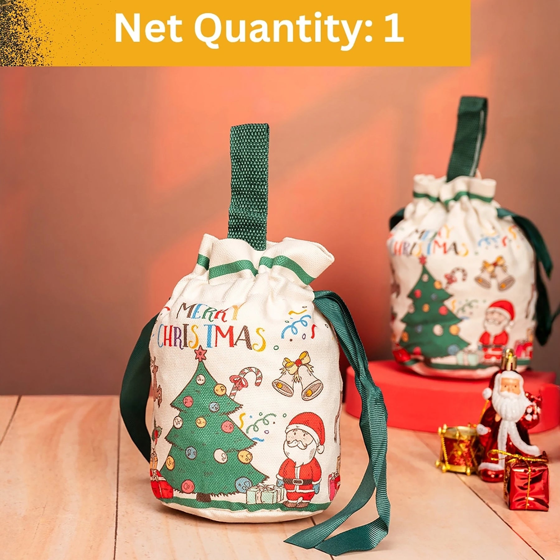 Pack your love in our Canvas Drawstring Christmas Gift Bag this holiday season. This Christmas gift bag has a vibrant Christmas print, making it ideal for gifting. This drawstring gift bag can hold up to two to three small gifts or many chocolates and candies along with greeting cards. It is durable and sturdy and easy to carry. The best part? Once its job as a gift bag is done, it doubles as an adorable storage bag for your small essentials