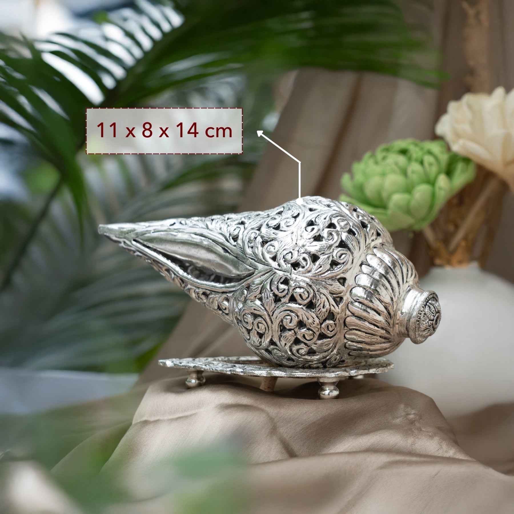 Celebrate the festival of lights with The Handcrafted German Silver Carved Shankh with Stand by The Zappy Box, a symbolic ornament that will bring divine energy and elegance to your holy space this Diwali. This pooja shankh ornament is a perfect Diwali pooja ornament, featuring meticulous carving and premium German silver, blending art and spiritual connection with every devotional setting.