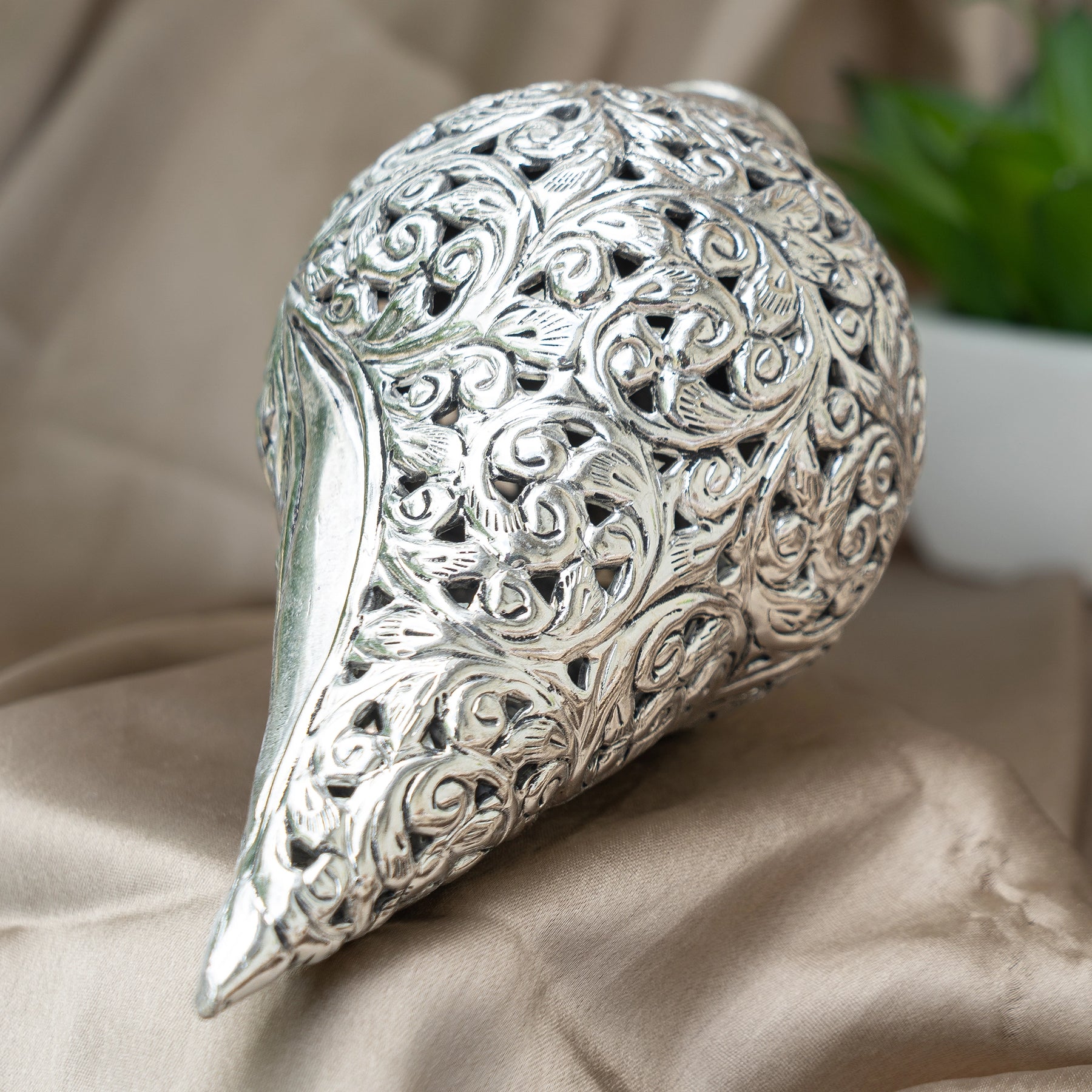 Positioning a carved shankh with a stand in your temple or meditation space during Diwali is said to attract positivity, purity, and spiritual awakening. The rich echoing sound of the shankh, when blown during rituals, maximizes spiritual vibrations and is said to repel negative energies while beckoning blessings and prosperity. The sturdy brass or German silver shankh stand ensures secure placement, utilizing maximum utility as well as aesthetics, rendering this shankh a permanent fixture for Diwali decor accents.