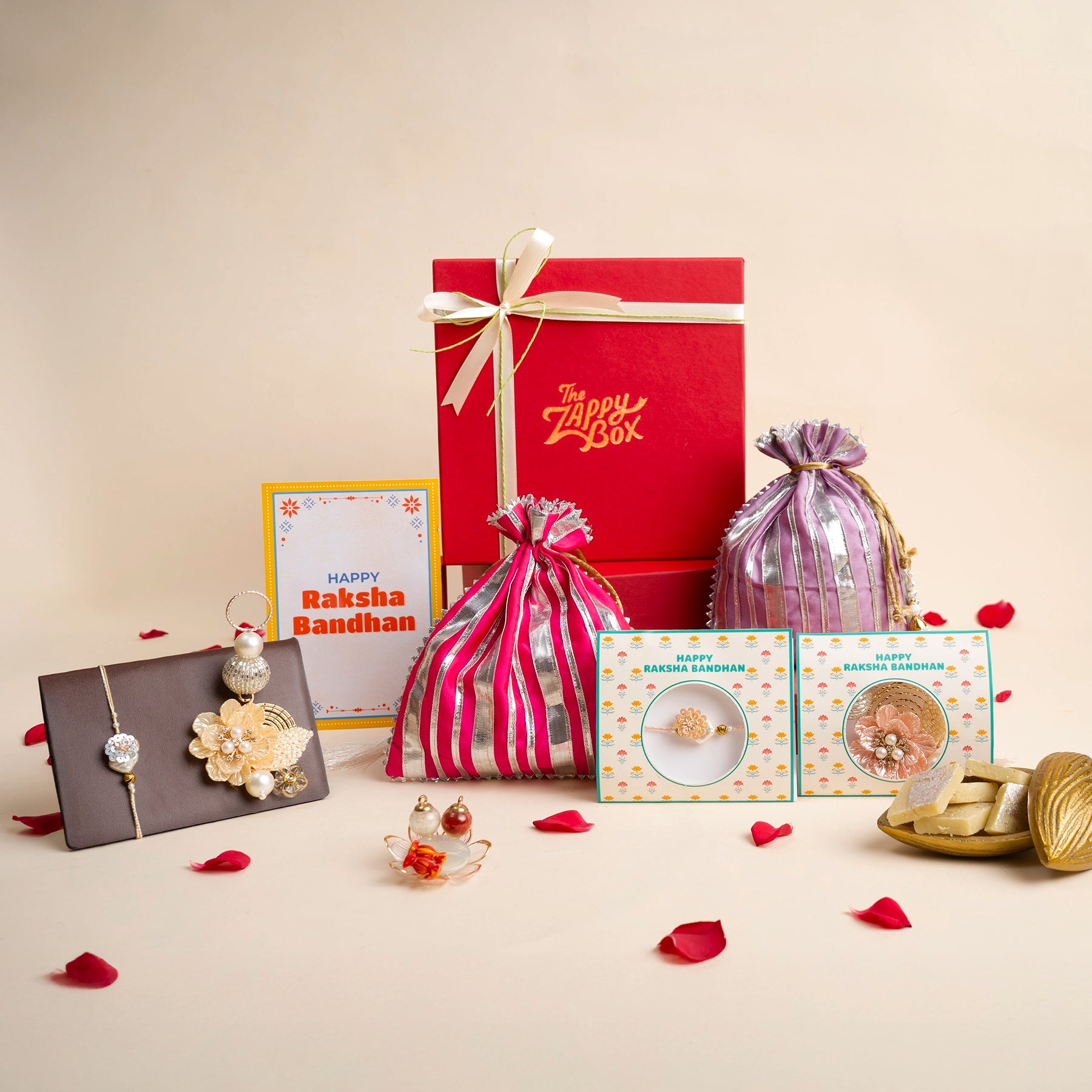 The Celebration Rakhi Hamper - For Bhaiya and Bhabhi is a playful and heartfelt Raksha Bandhan gift. A curated red-themed Rakhi celebration box with dry fruits, festive essentials & elegant packaging. It is ideal for Raksha Bandhan, Bhaiya-Bhabhi gifts, couple hampers, and family festive sets. To preserve the hamper, store dry fruits in a cool, dry place; keep rakhi away from moisture. Additionally, the Bhaiya-Bhabhi Rakhi set with festive treats in coordinated red packaging is ideal for a complete gifting gesture.