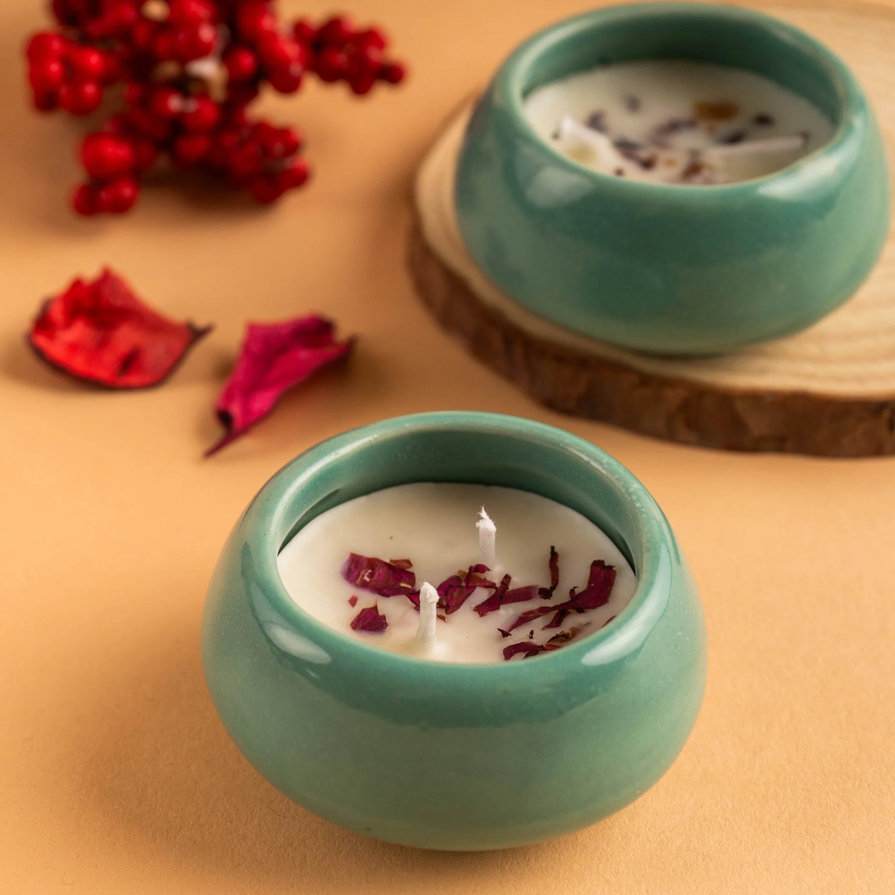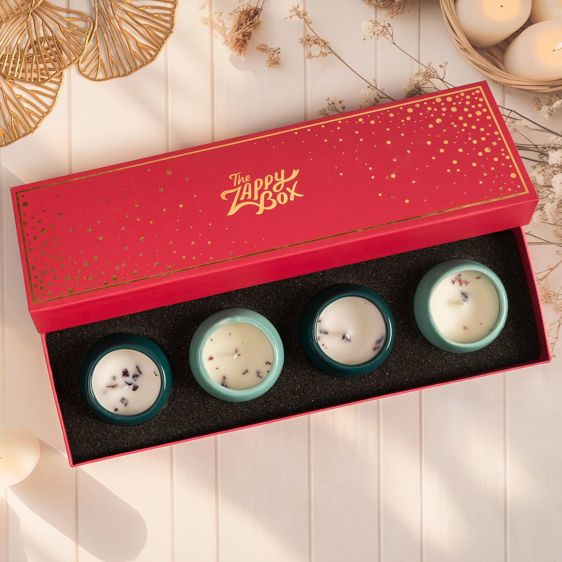 Our Rose Petal Infused Scented Candles Set of 4 offers a luxurious and eco‑friendly candle experience. Made from high‑quality premium soy wax for a clean, safe burn, each is housed in a stylish reusable ceramic candle holder. The dual‑wick design ensures a slower, even burn while enhancing ambience. Thoughtfully packaged in a beautifully designed cavity gift box, this luxury soy wax candle set is perfect for Diwali gifting and as a timeless accent for your home, complementing your Diwali decor.