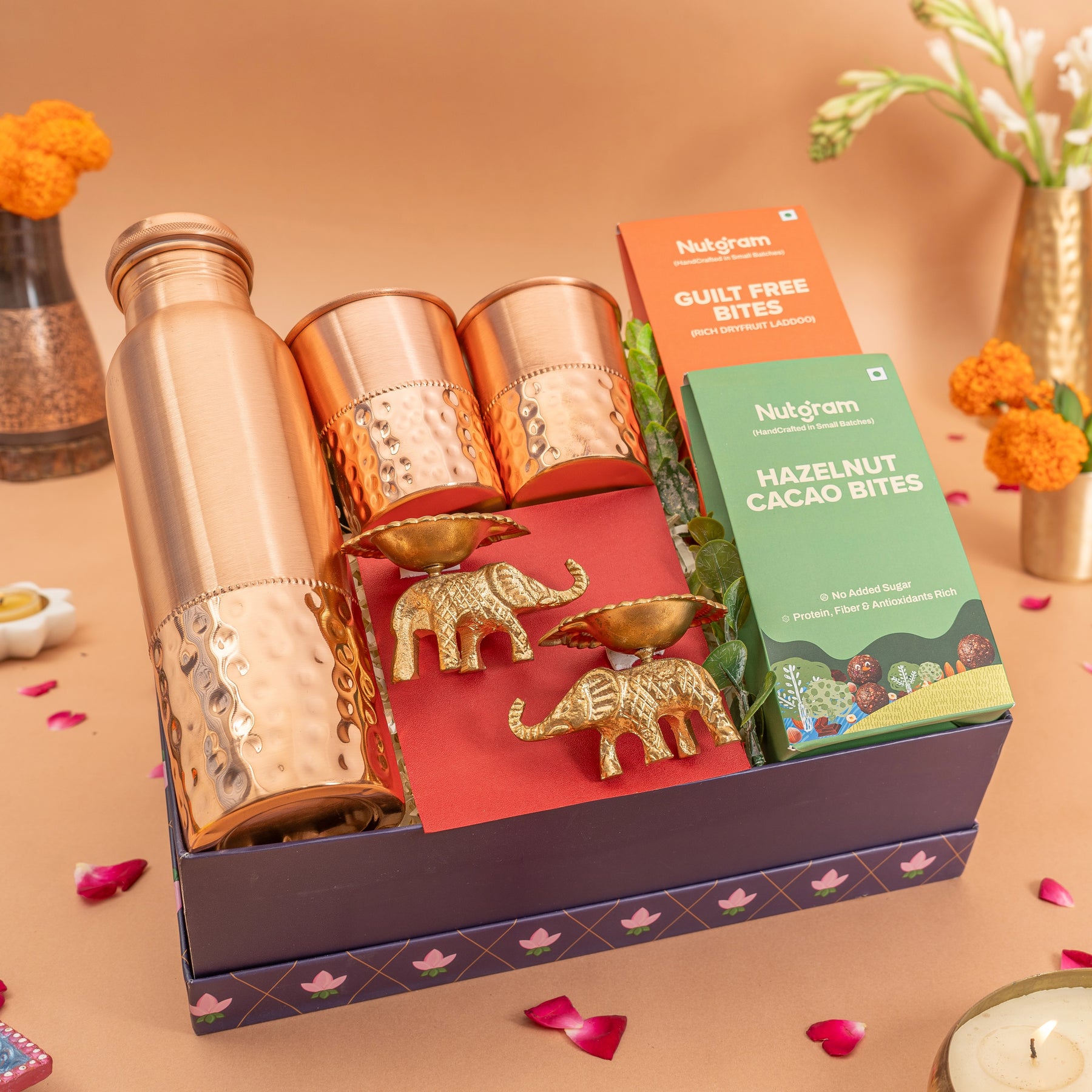 Make this Diwali a memorable affair for your loved ones with The Zappy Box’s luxurious copper charm gift hamper! The Diwali copper gift set comprises premium copper drinkware along with gourmet treats, thus adding a traditional, rich touch to your celebrations. The copper bottle and glasses hamper is an elegant choice, symbolizing good fortune and health, making a perfect gift for your colleagues and loved ones. A perfect representation of Indian craftsmanship, the Diwali copper hamper from India by The Zappy Box perfectly captures the festive spirit and helps create cherished memories for a lifetime.