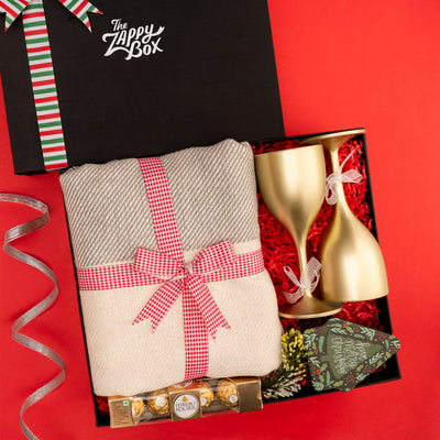 Inside this beautifully curated hamper is a warm and cozy throw blanket for you and your loved one to snuggle up on a chilly evening or cozy up and do a movie night. To pair it up, we have a set of two golden wine glasses for you to clink on the brink of new beginnings. No celebration is complete without sweets and for the same reason, this hamper comes with a pack of Ferrero Rocher chocolates.