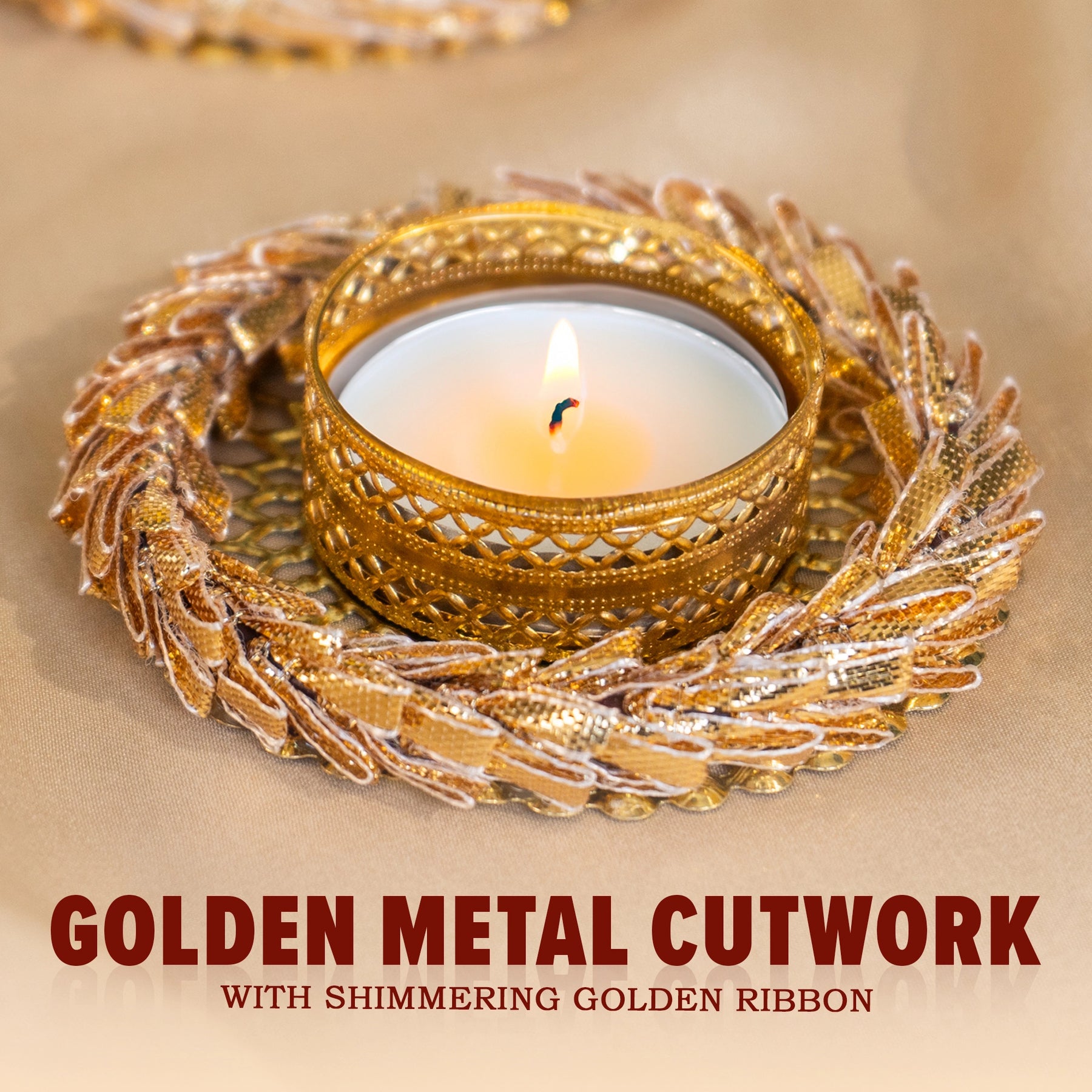 Create a warm and inviting atmosphere with our gold T-light candle holder set, designed to add a festive diwali charm to any space. Crafted from durable metal with intricate floral detailing, these holders feature an antique finish that blends tradition with elegance. Perfect for diwali pooja thalis, wedding décor, or as a highlight on your dining table, the metal gota patti candle holders bring a graceful glow to your celebrations. Available as a set of 2/6 festive diwali candle holders, they're versatile enough to suit intimate family gatherings or grand festive evenings.