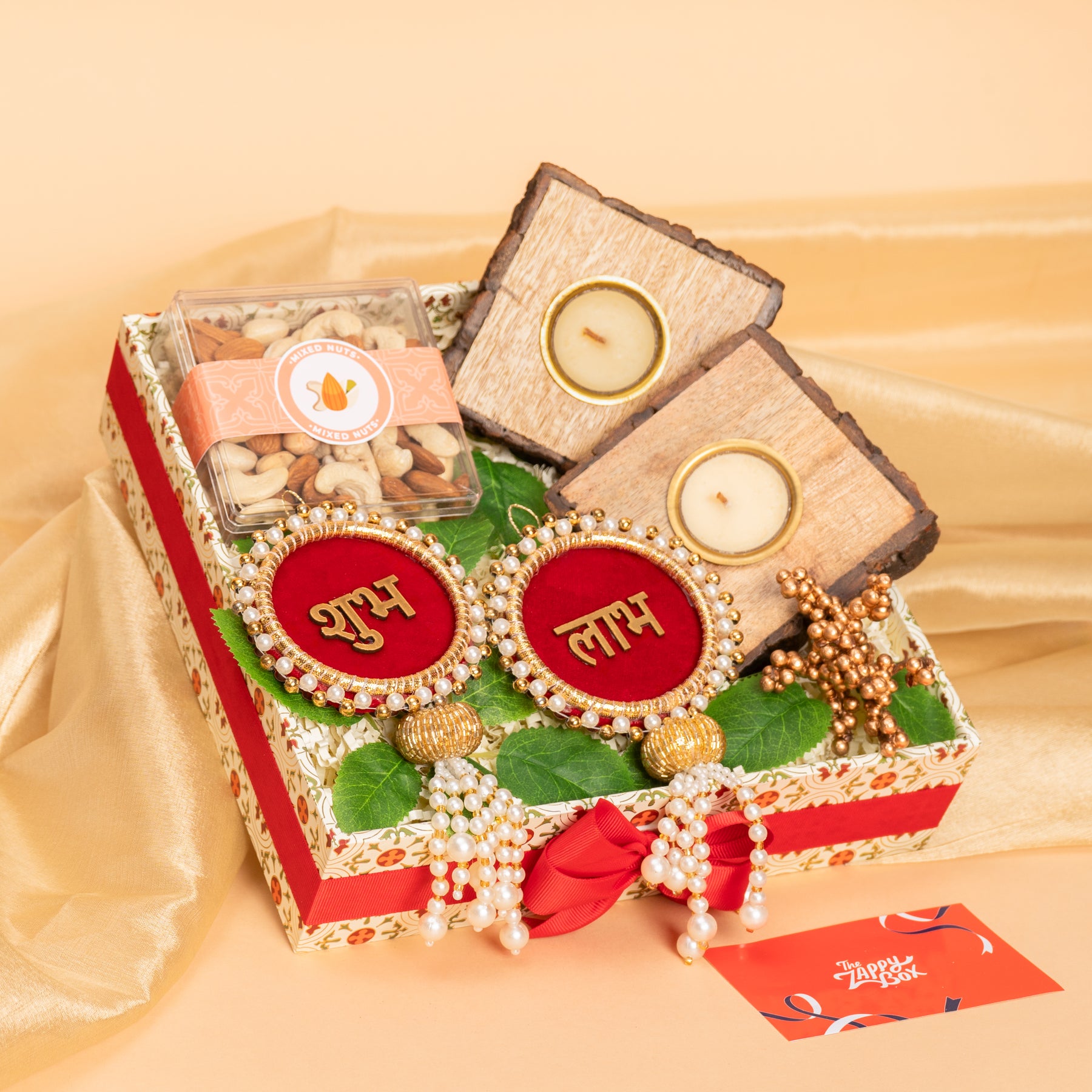 The Diwali Bliss gift hamper from The Zappy Box is a beautifully crafted Traditional Diwali gift box with cultural decor and snacks that perfectly capture the spirit of celebration. Savor the delight of Diwali. In addition to a colorful Shubh Labh hanging set to infuse your home with auspicious energy, this festive offering includes Mixed dry fruits and a Shubh Labh hanging, which is tastefully arranged in a stylish acrylic box.