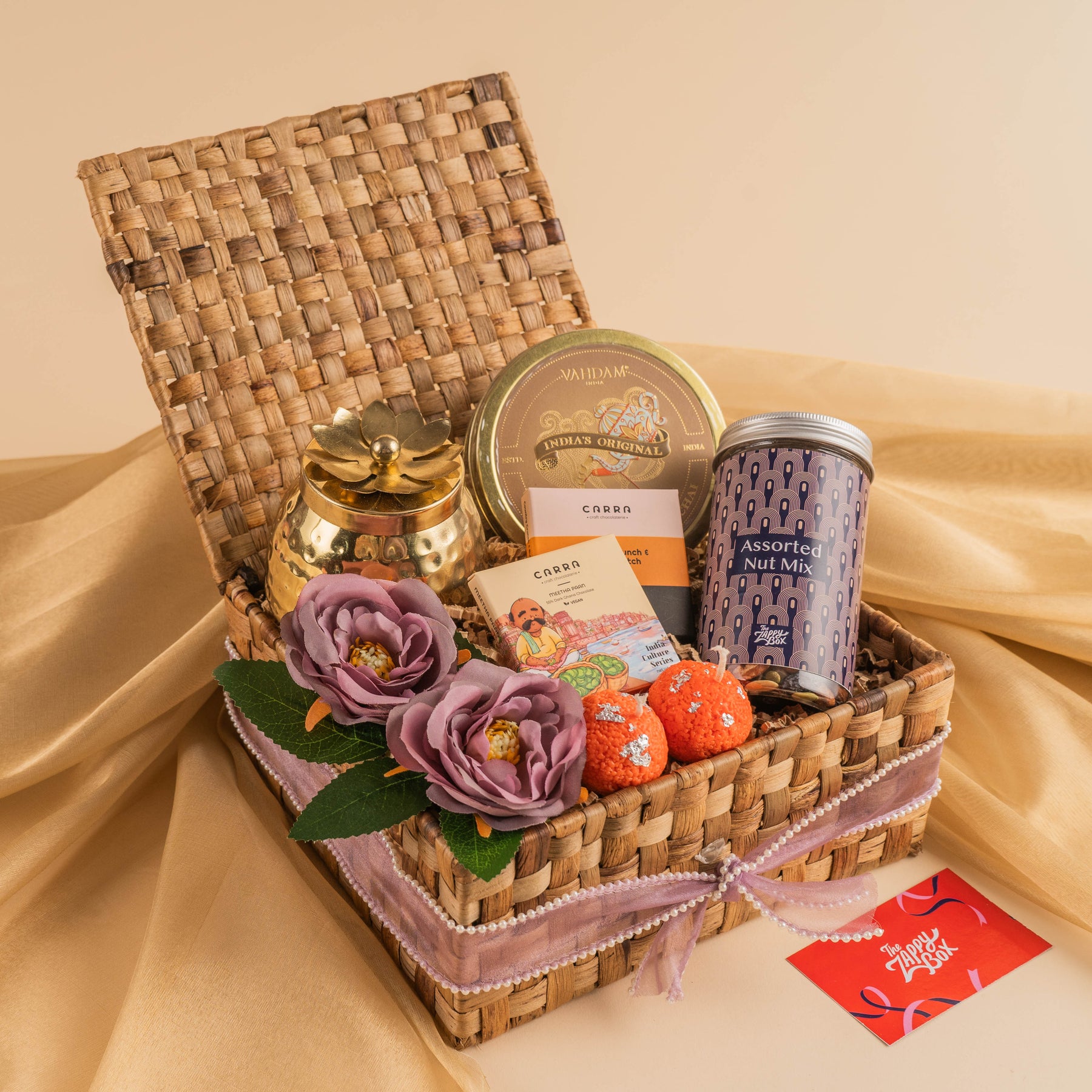 Celebrate the festive season in style with the Diwali Luxe #2 Hamper from The Zappy Box, a luxurious blend of elegant décor and gourmet delights crafted to make every moment special. This thoughtfully curated hamper features a stunning golden tin candle, perfect for adding a warm, radiant glow to your Diwali celebrations or as a beautiful home décor piece. Complementing the candle is a pair of ladoo-shaped candles, bringing a playful and colorful touch that symbolizes the sweetness of the festival. Enjoy the delicious Assorted Box of Nut Mix by Manohar, carefully selected to provide a wholesome and flavorful snack experience to share with loved ones.