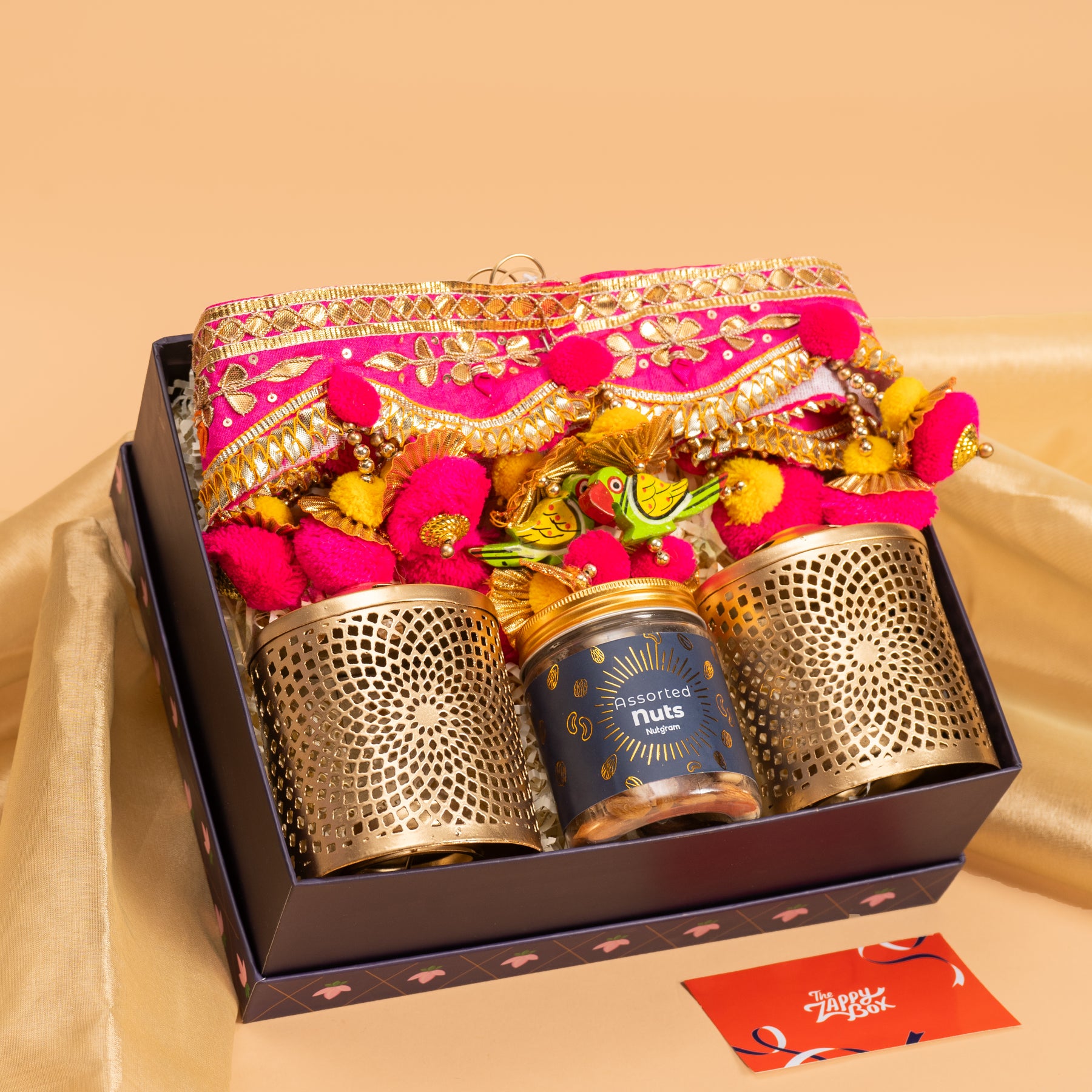 Make your Diwali gifting truly unforgettable with Festive Fiesta, a luxurious gift box filled with warmth, light, and tradition. Thoughtfully curated with handcrafted decor, flavorful nuts, and premium copperware, this hamper is perfect for friends, family, or colleagues. From elegant lotus diyas to vibrant torans and gourmet cashews, each item inside reflects festive joy. Whether you're attending a Diwali dinner or sending warm wishes from afar, this hamper brings celebration straight to their doorstep.