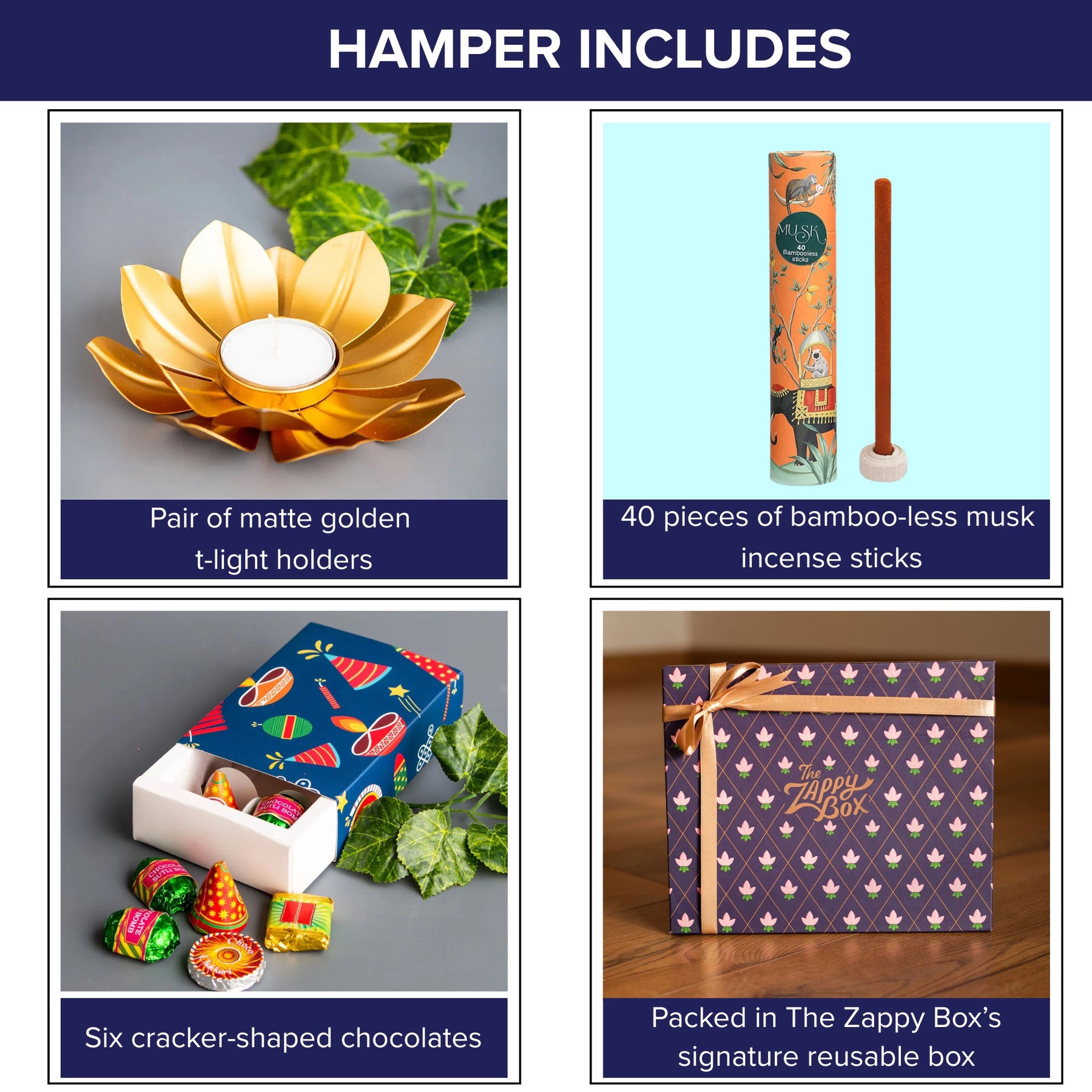 Brighten up any occasion with the elegant Floral Fusion Gift Box from The Zappy Box, a perfect blend of subtle luxury and festive charm. This thoughtfully curated hamper features a pair of matte golden t-light holders, crafted to add a warm, inviting glow to your home décor or celebration setting. Accompanying these are 40 pieces of bamboo-less musk incense sticks that create a serene and calming ambiance with their rich fragrance. Indulge in the joyful sweetness of six cracker-shaped chocolates, designed to delight both young and old alike. Adding a splash of natural beauty, the box includes two decorative flowers that enhance the unboxing experience and add to your festive décor.
