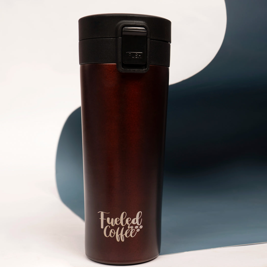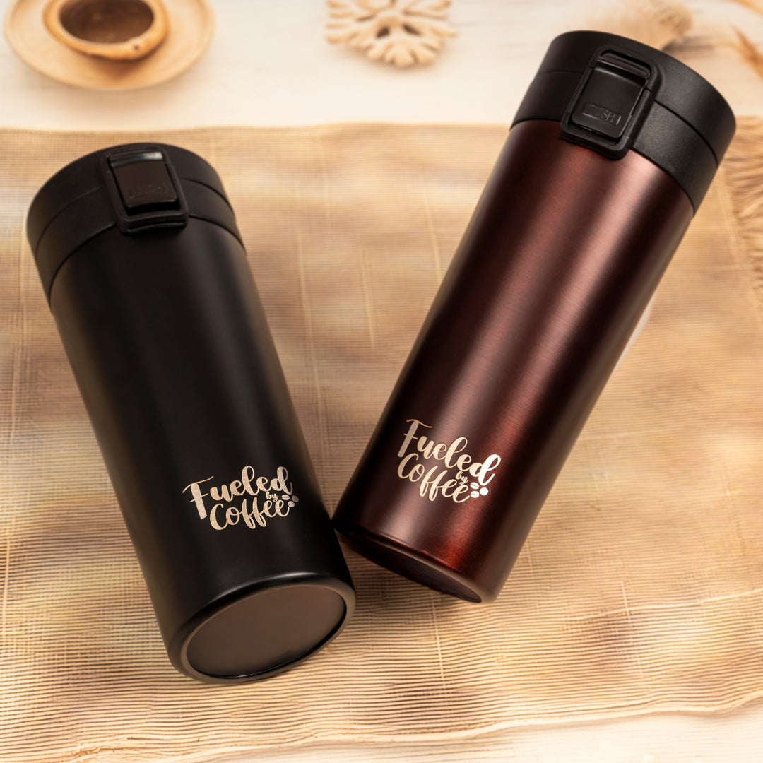 Start your day with The Zappy Box’s coffee fueled by coffee travel tumbler. It can be a great companion to your daily life. Our 400 ml tumbler coffee mug is especially designed for people who deal with deadlines and work under pressure until late. This tumbler sipper ensures that your beverage remains hot or cold for hours. The double-walled insulation makes sure your hot tea remains piping hot during your meetings, while iced coffee remains chilled throughout the day. The coffee tumbler with a lid comes with no leakage protection, making it spill-proof. The sleek matte finish and the ‘Fueled By Coffee’ quote make it a motivational utility gift option. The hot and cold tumbler comes in two color options: bold black and warm brown tones.