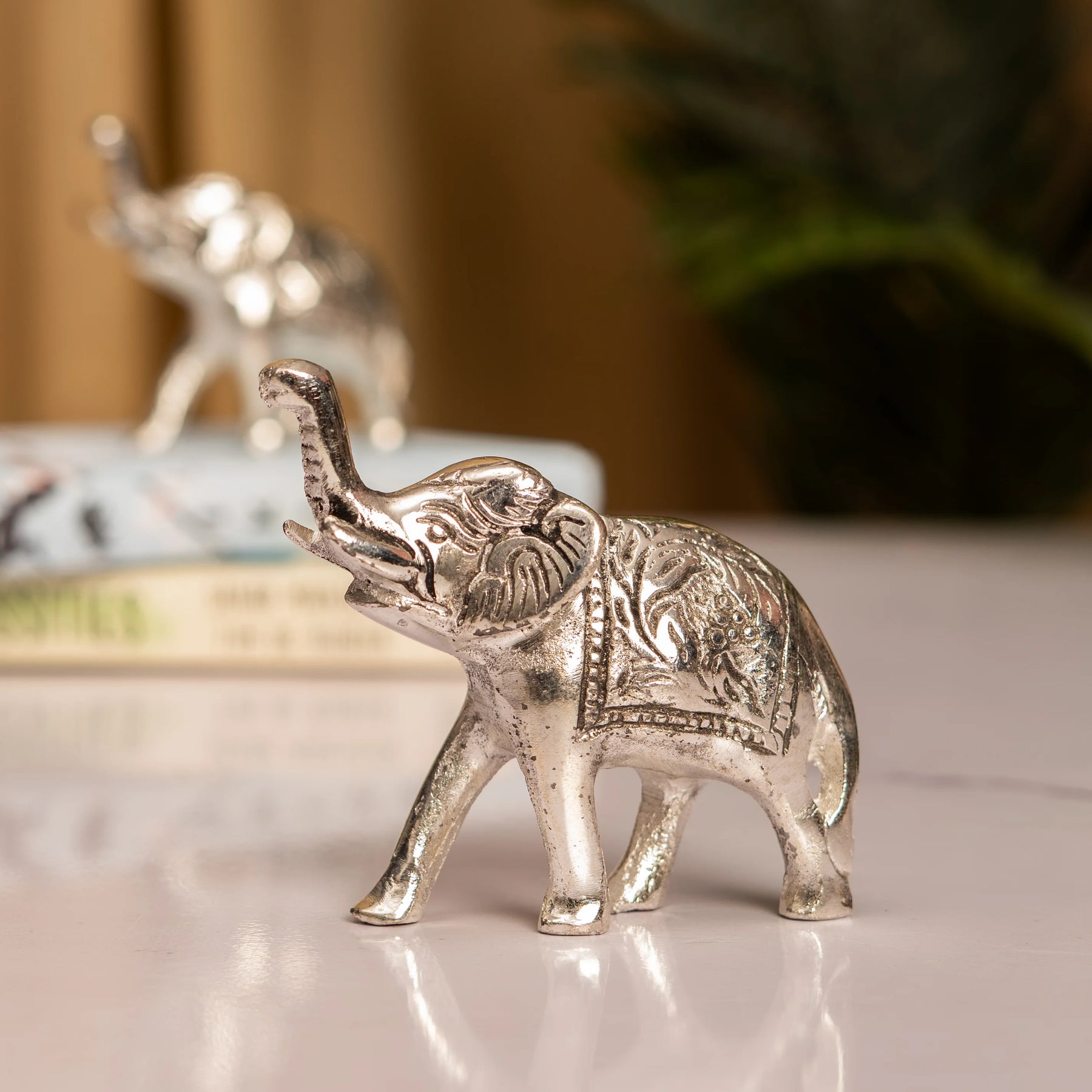 Elevate your space with this exquisite set of two German Silver Elephant Decor. These finely crafted elephants for home decor radiate strength and wisdom to any setting. They are made from high-quality German silver, bringing a sense of grandeur to any space and making them a charming addition to your Diwali decor. Each piece has intricate details and a stunning antique finish that pays homage to traditional Indian artistry.