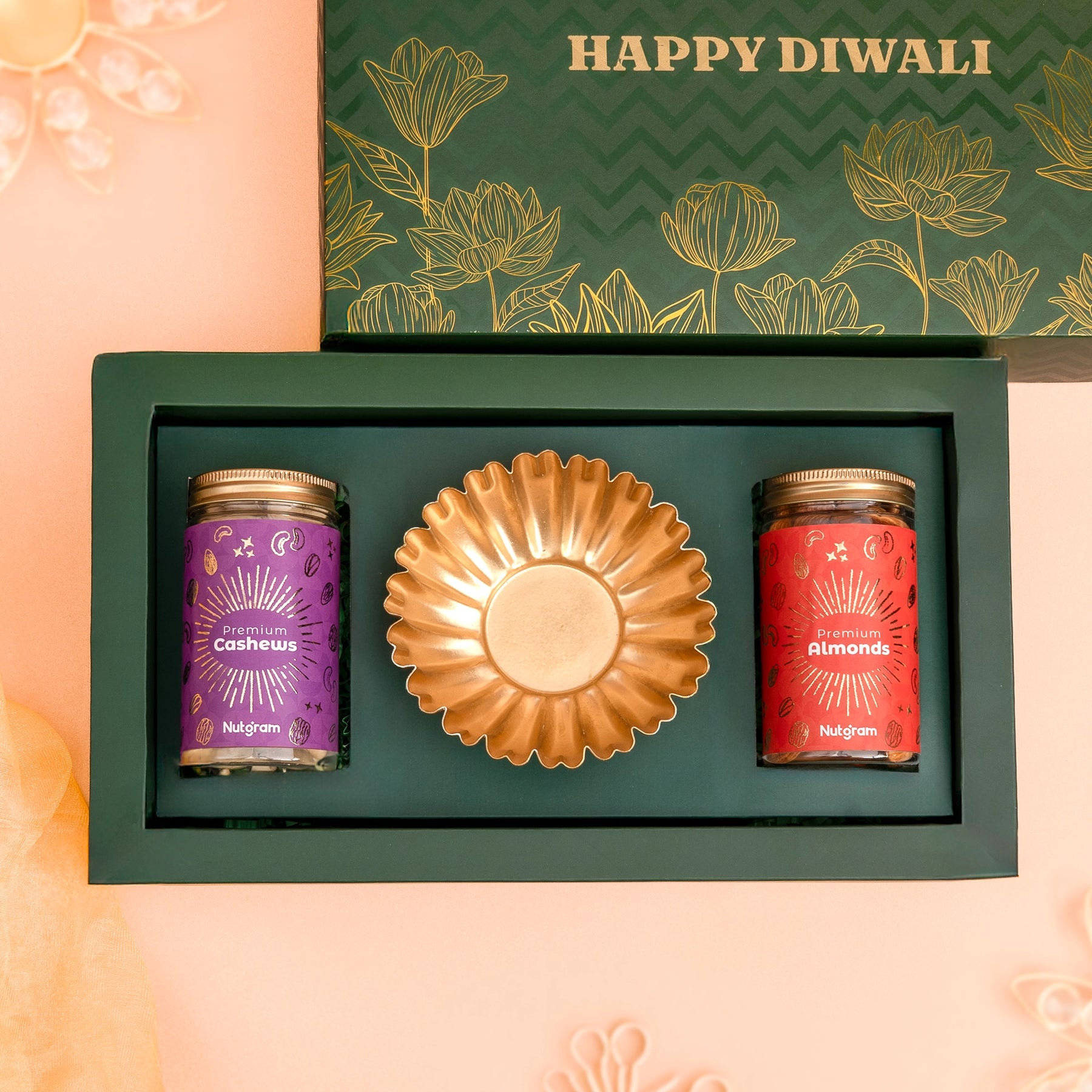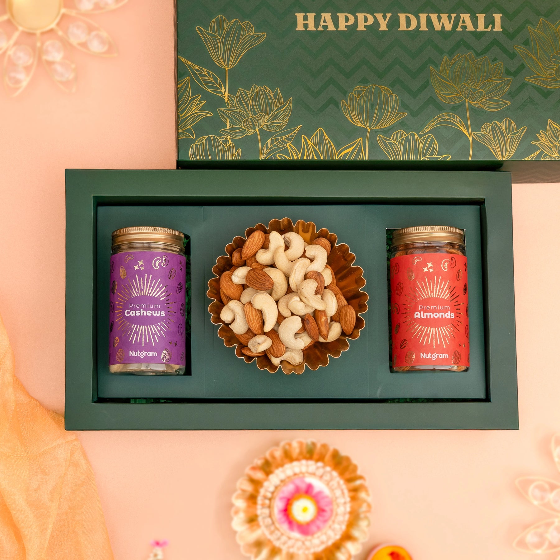 The Golden Floral Glow Hamper stands out for its elegant combination of floral-themed decor, gourmet dry fruits, and festive accessories, making it one of the most sought-after premium gift hampers online. This hamper is ideal for those seeking a luxurious yet thoughtful floral gift hamper online, personalized for memorable gifting moments. Similar options like the Floral Glow Diwali Hamper or Golden Glow Diwali Gift Set offer variations in decor styles and treats, catering to diverse preferences and occasions. For a lasting impression, select hampers showcasing reusable boxes and customizable greeting cards, hallmarks of The Zappy Box's premium gifting experience.