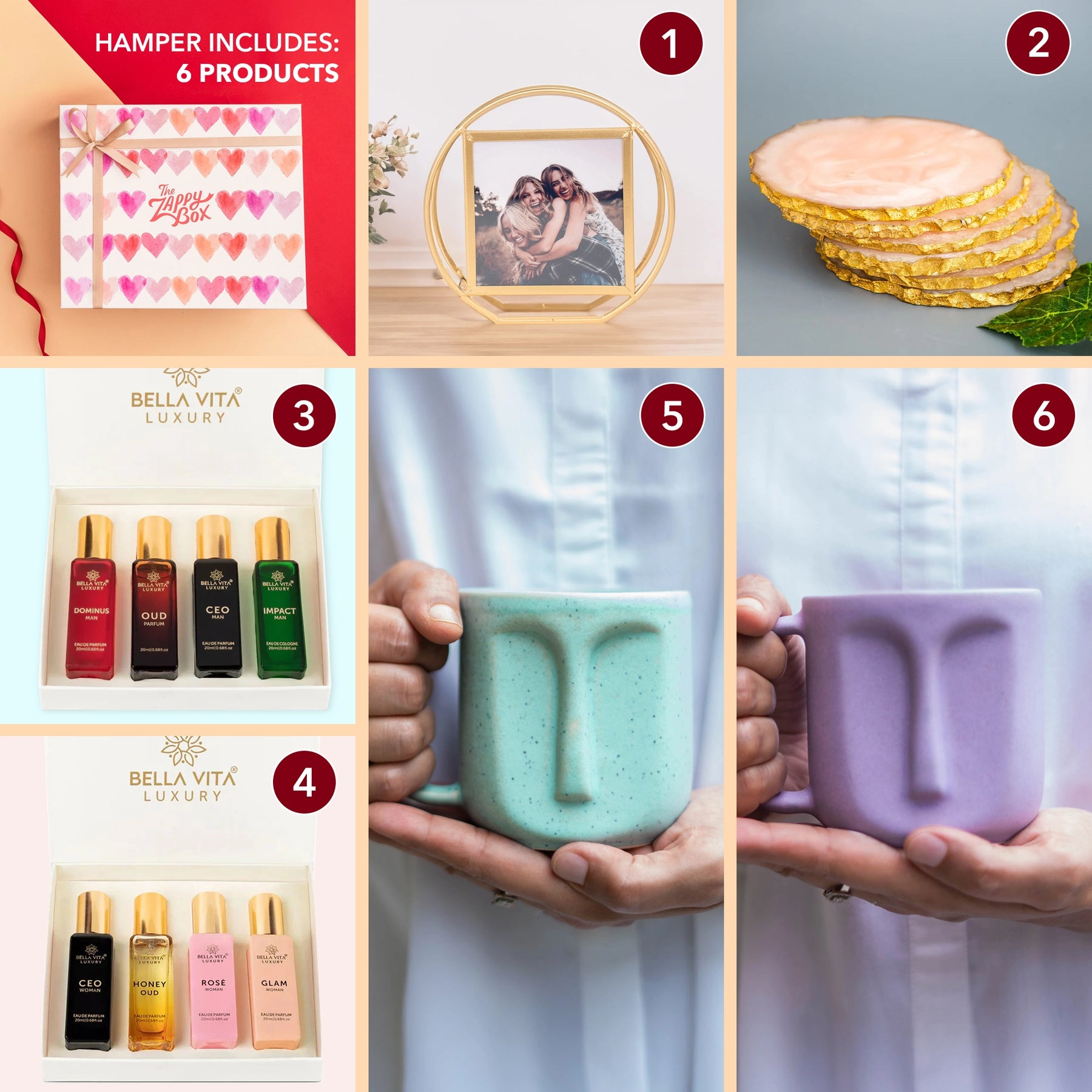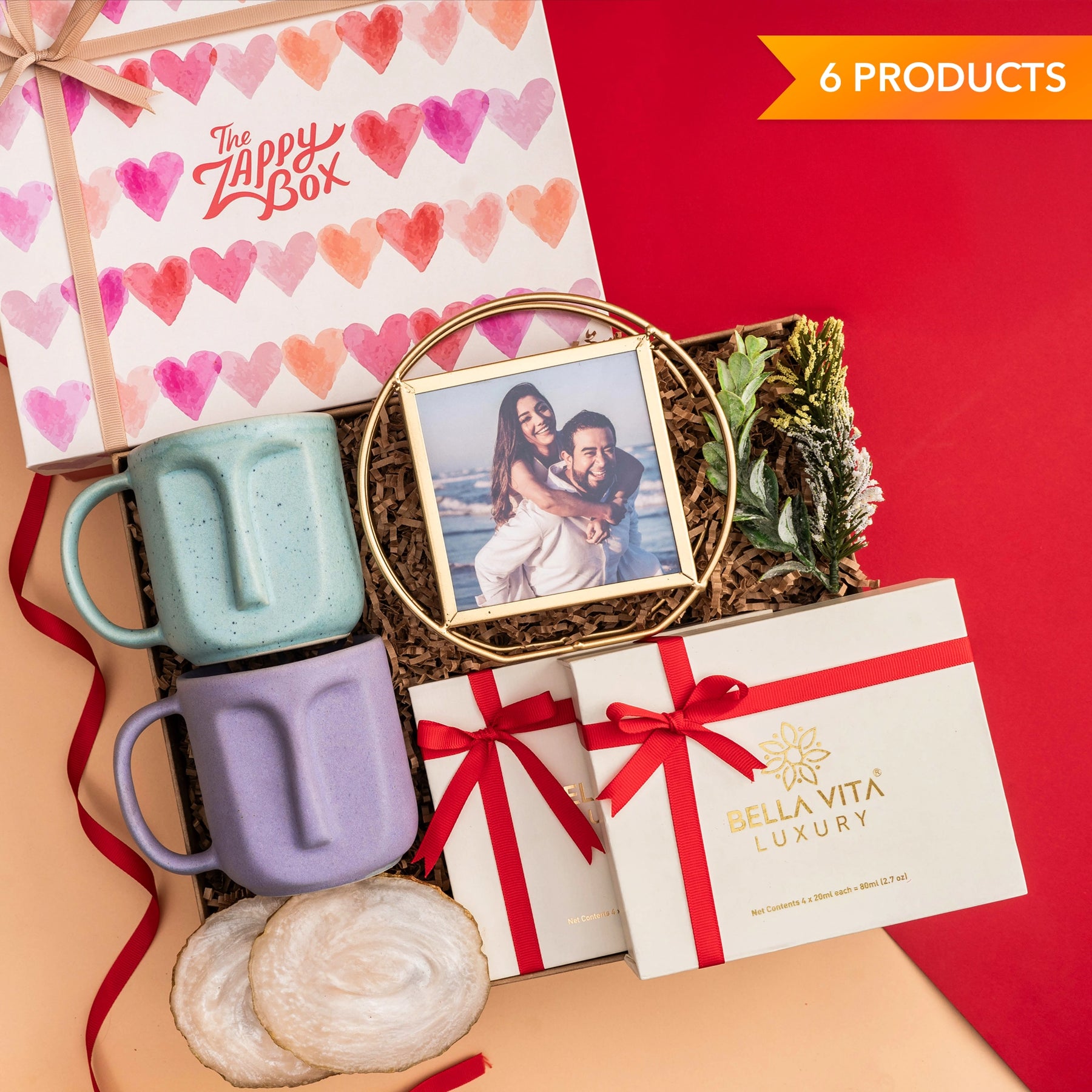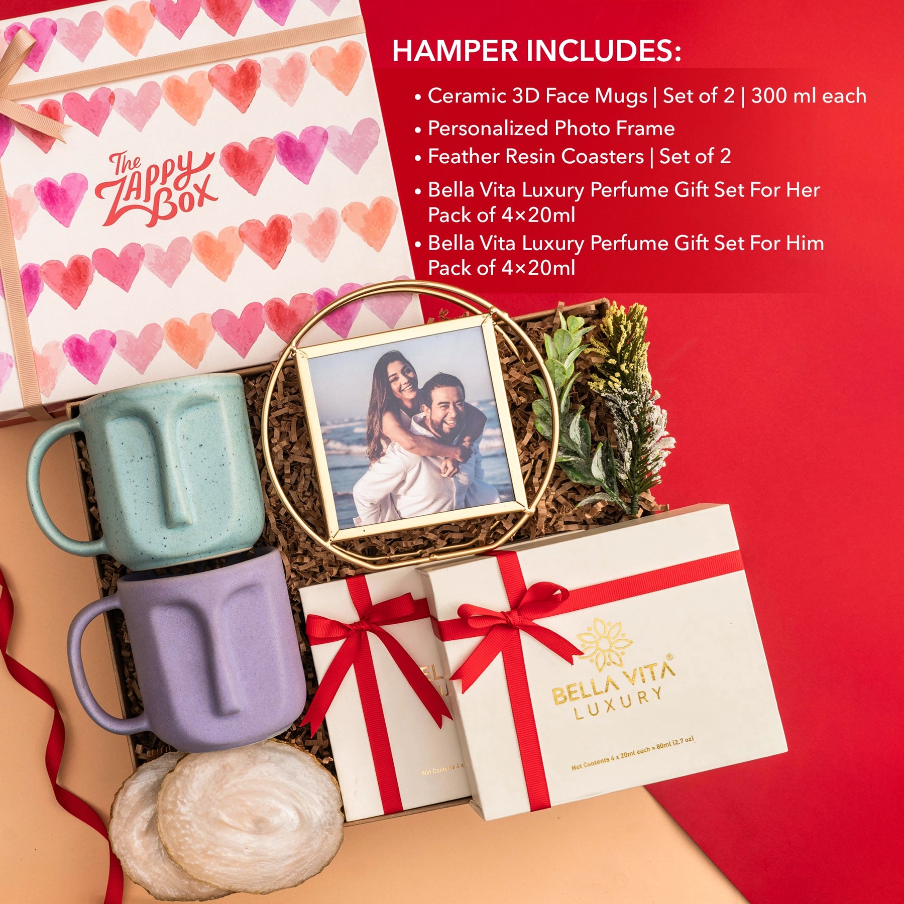 Express your love with the Golden Love Gift Hamper from The Zappy Box, a perfect blend of personalization, luxury, and thoughtful details. This romantic hamper features a pair of artistic ceramic 3D face mugs, ideal for sharing cozy moments. A personalized photo frame adds a heartfelt touch, while feather resin coasters elevate your tabletop styling. The hamper includes luxury Bella Vita perfume gift sets for both him and her, each containing four exquisite 20ml fragrances.