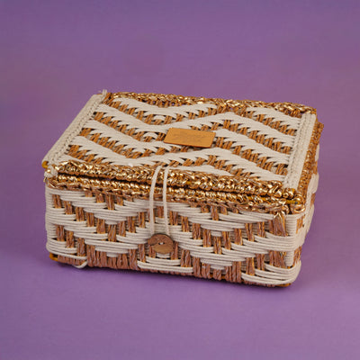 - Design: Handwoven-style with gold-toned detailing