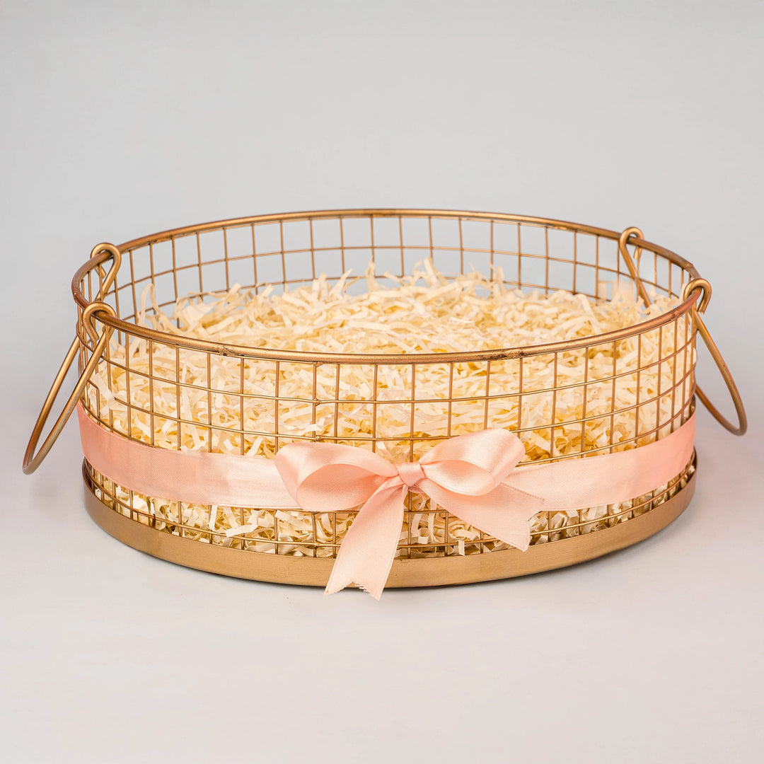 Whether you're curating a Rakhi gift box, a Diwali sweet basket, or a wedding hamper, this stylish basket brings the right blend of shine and sophistication. The open mesh design allows your carefully chosen gifts to be displayed beautifully, while the curved edges and metal handles make it easy to carry and reuse. Sustainable, stylish, and versatile, the Golden Zappy Gift Basket is your go-to choice for premium gifting with impact.