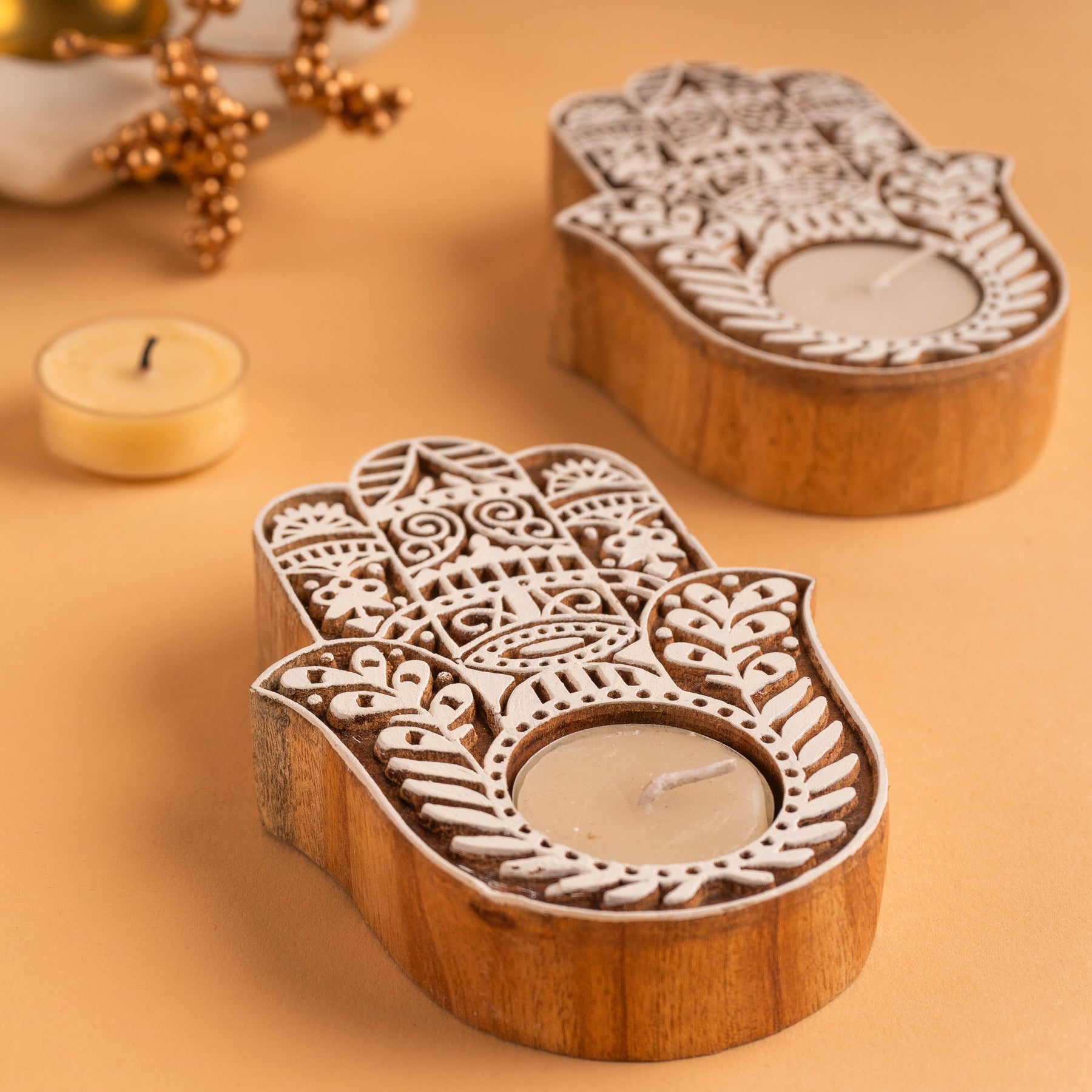 Bring elegance, spirituality, and protection to your home décor during diwali with the exquisite Hamsa T-light Holder from The Zappy Box. Crafted meticulously from natural brown wood, this handcrafted t-light holder features intricate flower engravings that beautifully blend artistry with symbolism. The Hamsa, an ancient emblem of divine protection against negativity and the promise of good luck, makes this piece not only decorative but meaningful as well.