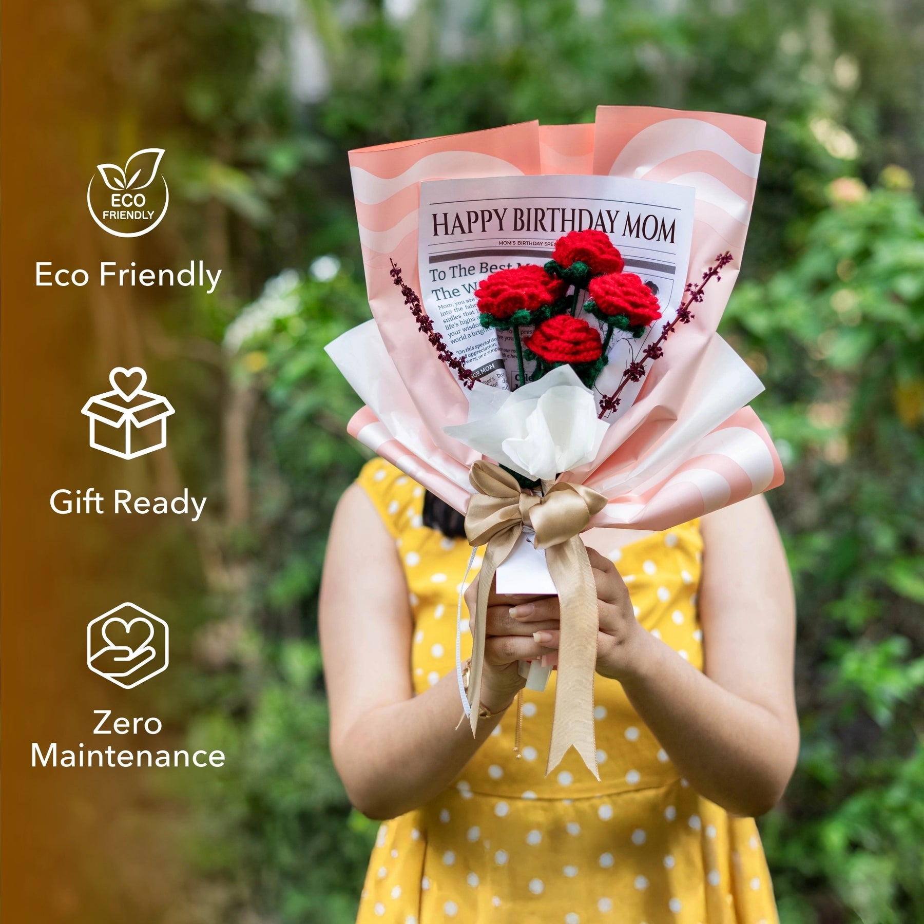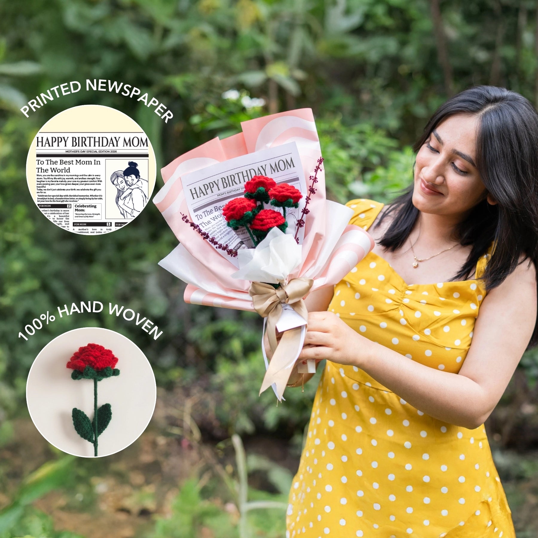 Celebrate your mom’s special day with our Happy Birthday Crochet Rose Flower Bouquet. This beautifully crafted crochet rose bouquet is made with high-quality yarn. It is lovingly handmade with attention to every detail; it’s a meaningful way to show how much you care. They are an eco-friendly and better alternative to fresh flowers, as they require little to no care and can last forever. Perfect blend of aesthetics and sustainability that elevates your space.