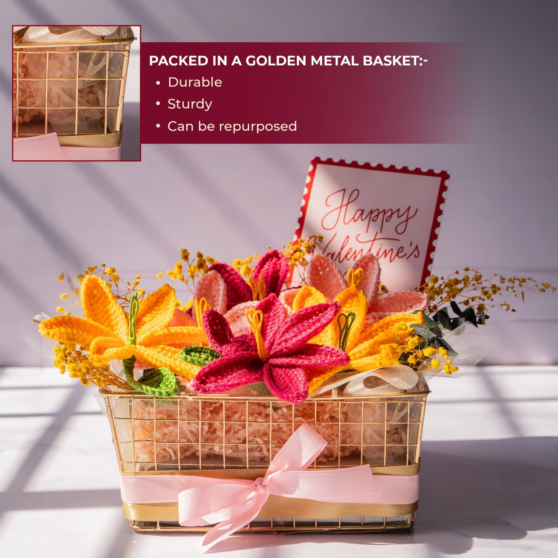 Your love deserves a special toast, and what's better than the timeless beauty of crochet Valentine's flowers? So, replace the short-lived, real flower bouquets with our lily flower bouquet basket and make your present stand out from the rest! This basket of crochet lily flowers is made with premium quality metal and is durable, while also having a minimal, earthy feel.