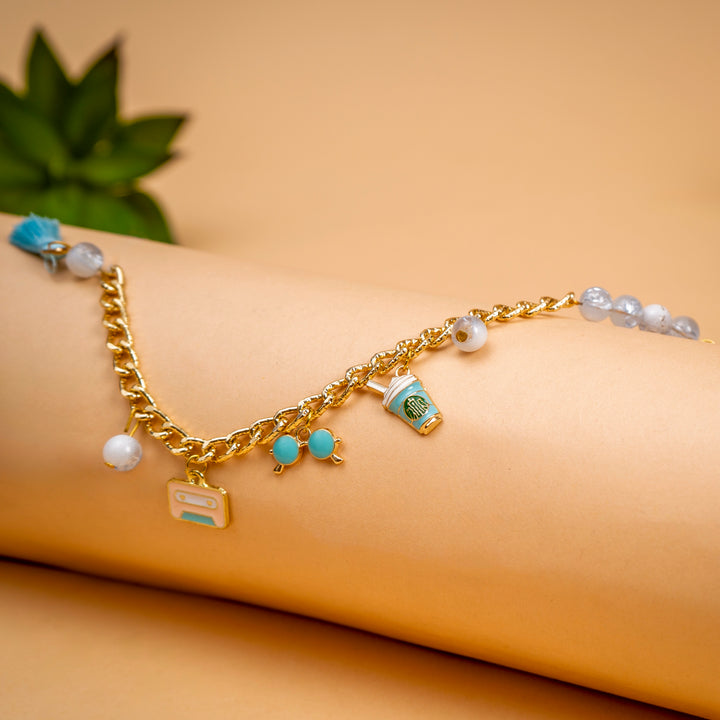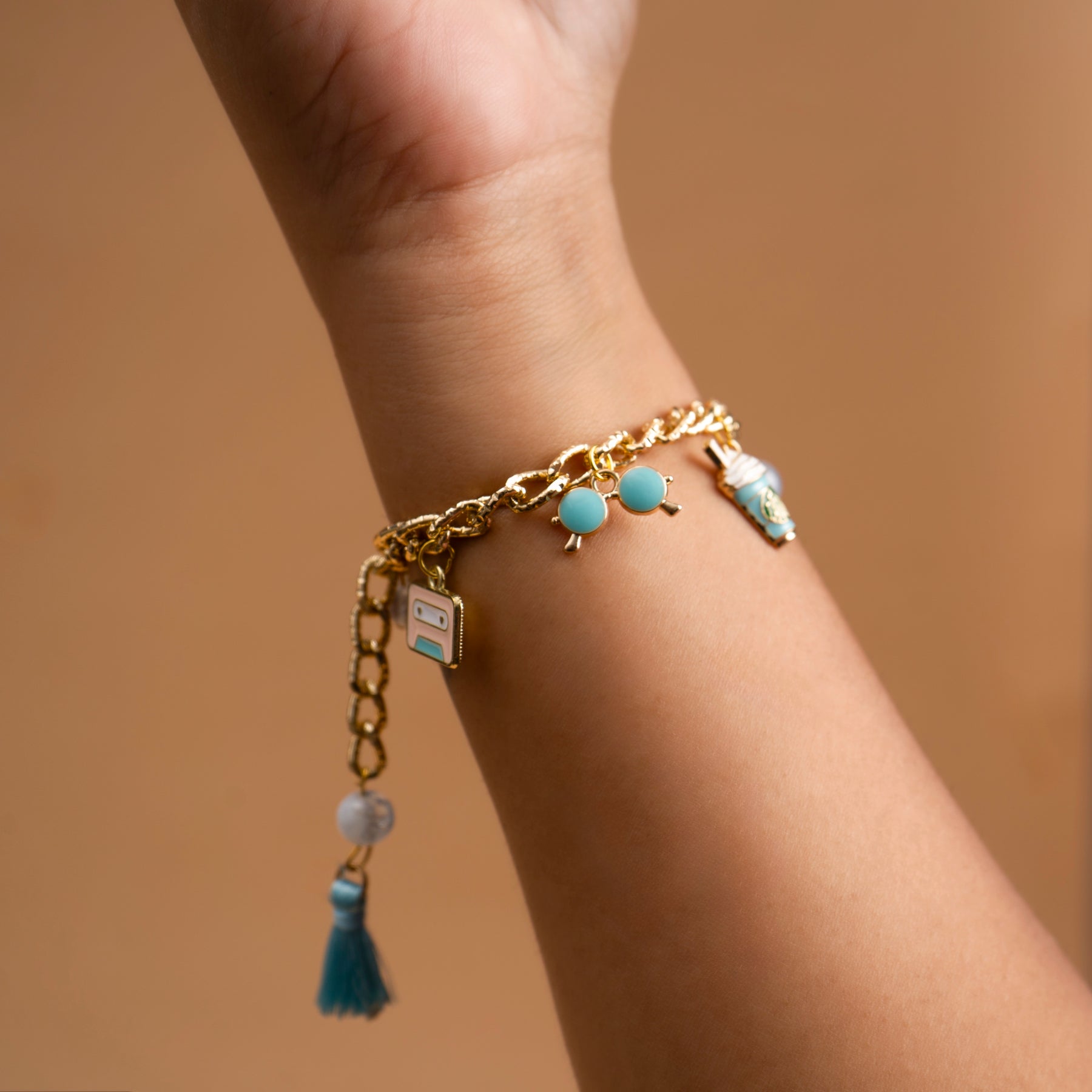 The Love Bond Charm Bracelet comes in an elegant and dainty style. It falls under the category of wrist accessory. The design represents a sleek charm bracelet with enamel detailing symbolizing the timeless bond between siblings, designed especially for sisters. It is ideal for gifting on Raksha Bandhan, birthdays, or as a meaningful gesture for your sister. To increase longevity, we recommend avoiding water, perfume, and direct sunlight; store in a dry pouch. Additionally, it is lightweight and adjustable, perfect for daily wear or festive gifting with sentimental value.
