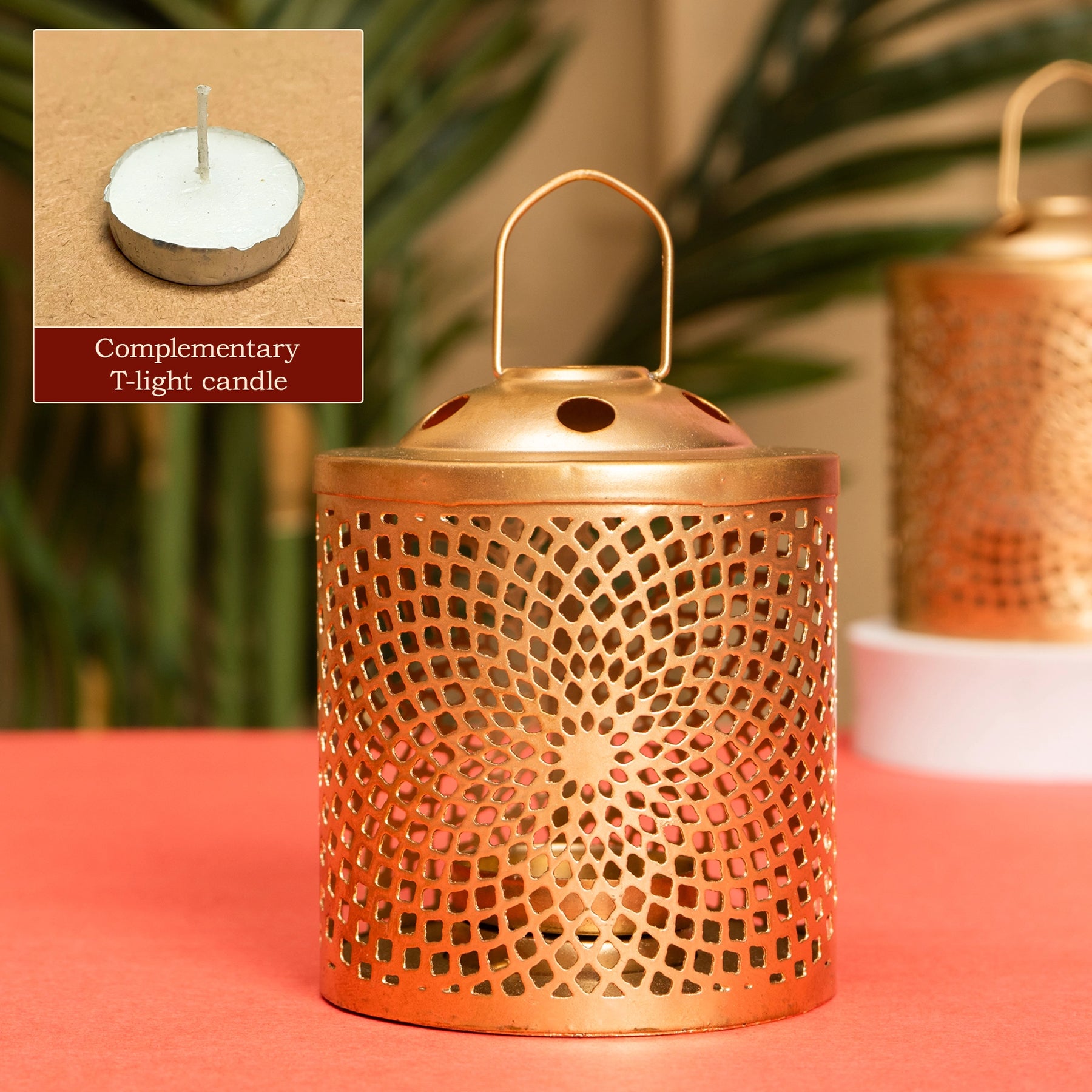 Elevate your diwali décor with the elegant Metal T-Light Candle Lantern from The Zappy Box, a radiant addition to Diwali, pooja, or any special celebration. Crafted from premium-quality metal for lasting durability, this lantern features a gleaming golden finish that infuses your space with regal warmth and sparkle. Lightweight and easy to hang, the lantern brings versatility to your home or event décor. Simply place the complementary t-light candles inside, and experience a soothing, ambient glow that sets the perfect diwali mood. The distinctive lantern design is not only functional but also makes a striking showpiece, blending traditional charm with modern style.