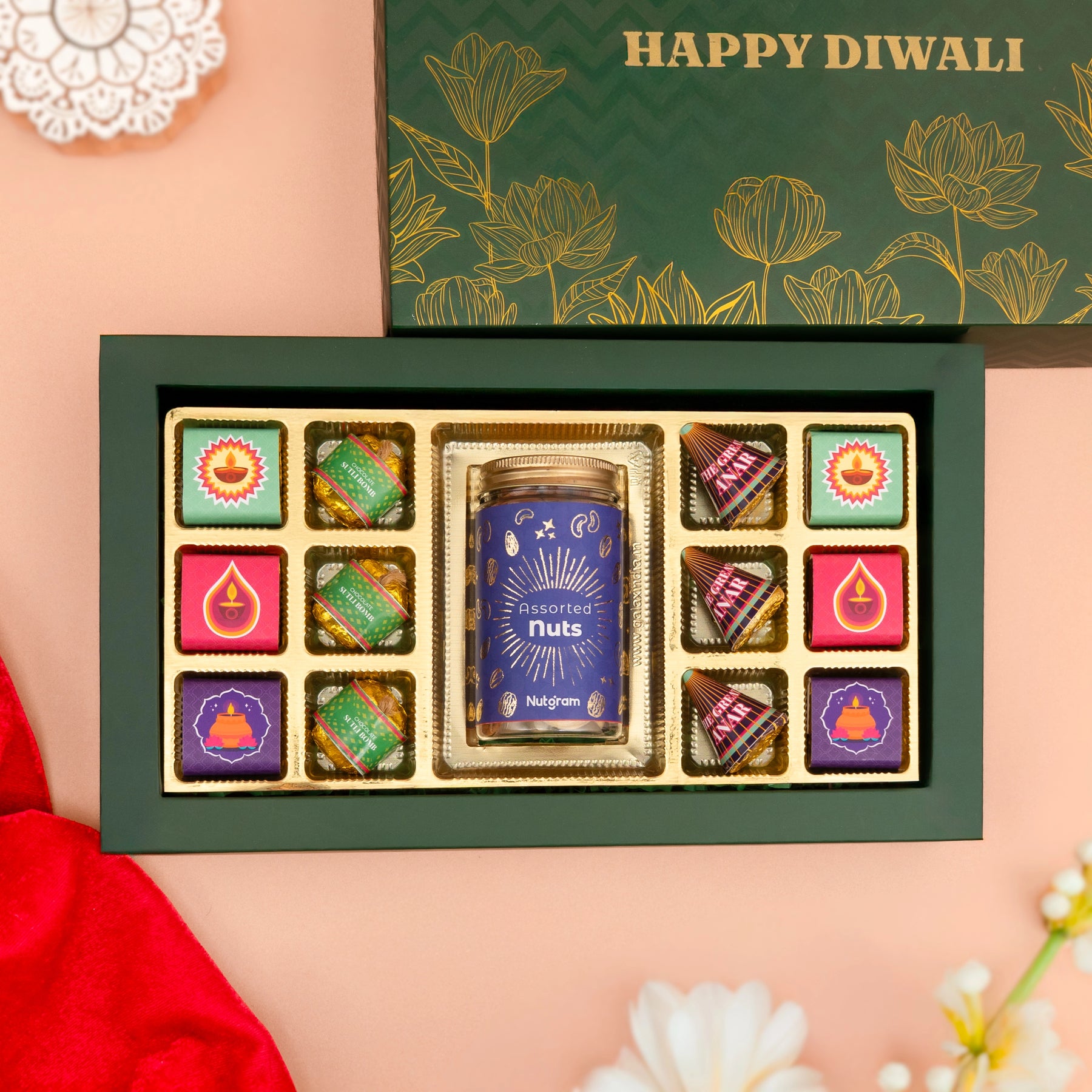 The Mixed Choco Nuts Hamper from The Zappy Box is a gourmet chocolate and nuts gift hamper, perfectly blending rich chocolates with crunchy mixed nuts for a delightful indulgent experience. Curated to deliver moments of joy, this premium gift hamper is ideal for birthdays, Diwali, corporate gifting, or simply sharing happiness with loved ones. Featuring an assortment of high-quality chocolates and premium nuts, each bite offers a harmonious fusion of sweetness and crunch, making it a thoughtful treat for any occasion. The hamper is beautifully packed, reflecting elegance and care.
