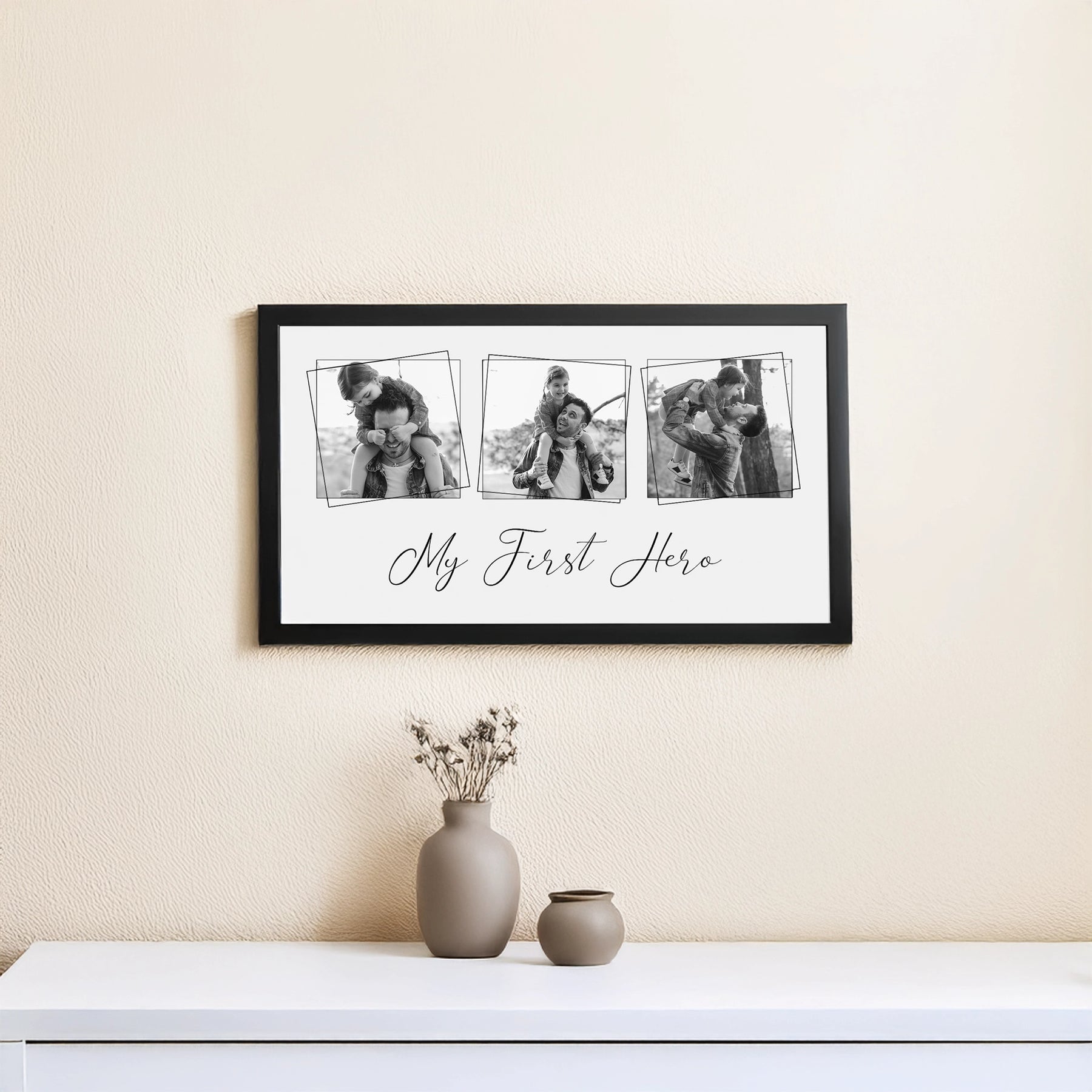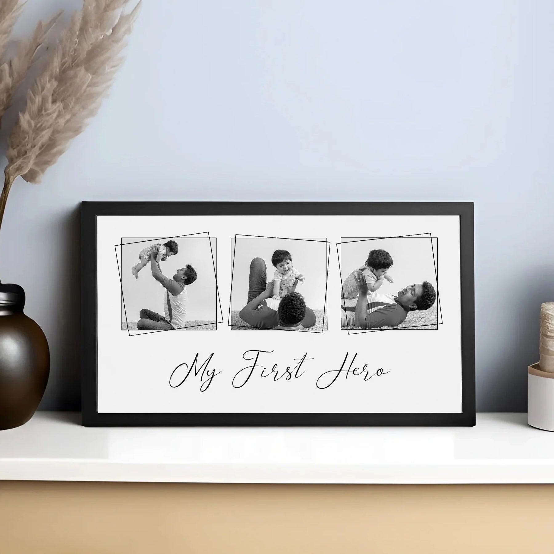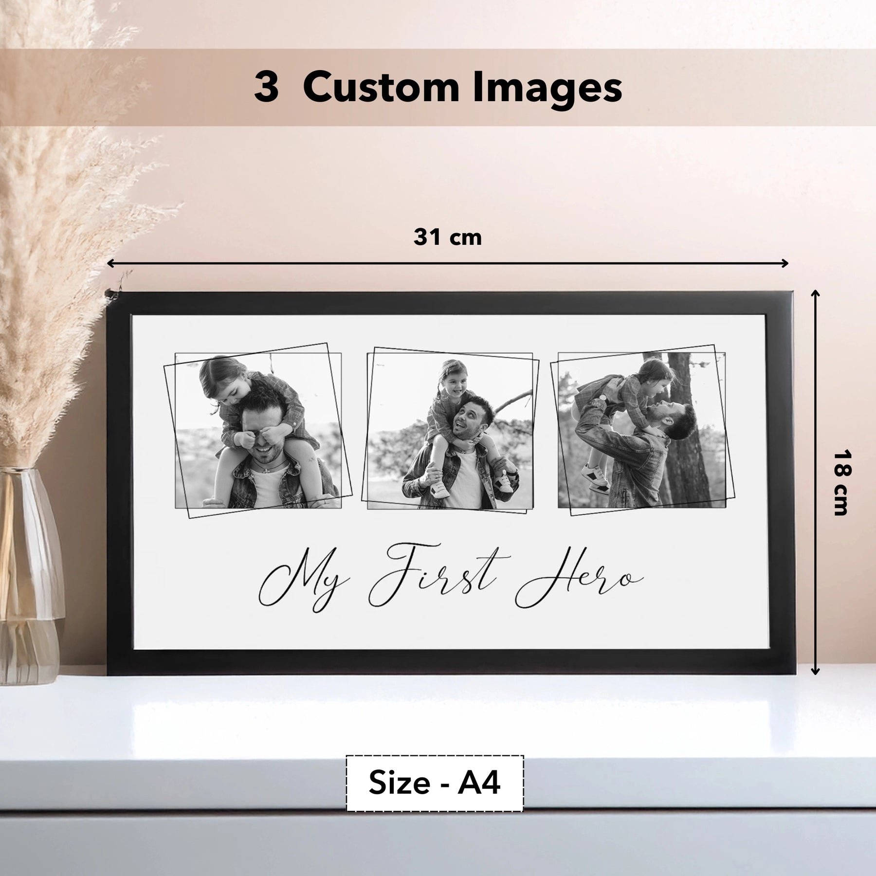 Show your love and gratitude towards your dad with our My First Hero photo frame. The versatile dad photo frame collage design allows you to showcase multiple precious memories you have shared with your father in a single frame. The dad and daughter photo frame will serve as a beautiful tribute to the father-child relationship, no matter whether it is about celebrating milestones or capturing tender moments of our beautiful lives. The beautiful My First Hero photo frame from The Zappy Box is perfect for celebrating the bond between fathers and their children. The premium wood frame measures 31 cm x 18 cm and accommodates 7.6 x 7.6 cm photos. That’s what makes it an ideal photo frame for Father’s Day gifts that will melt your dad’s heart!