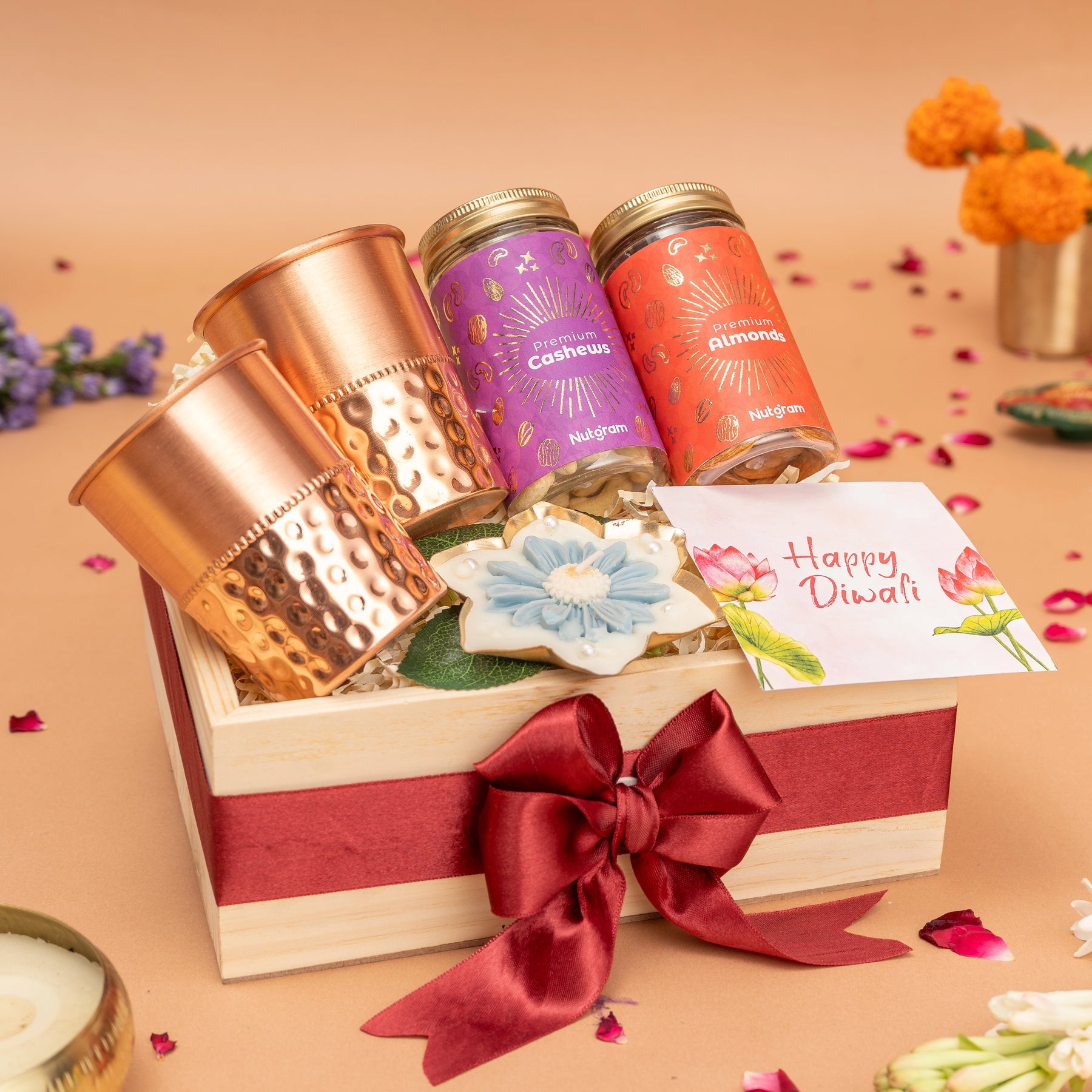 Alongside these exquisite copper glasses, the hamper includes a fragrant floral flower candle to create a soothing ambiance and premium jars of roasted cashews 90 g and almonds 110 g that offer delicious, nutritious snacking options rich in healthy fats, protein, and essential minerals. A Diwali greeting card with your personalized message adds a heartfelt touch, making it ideal for festive occasions or as a wellness-focused gift.
