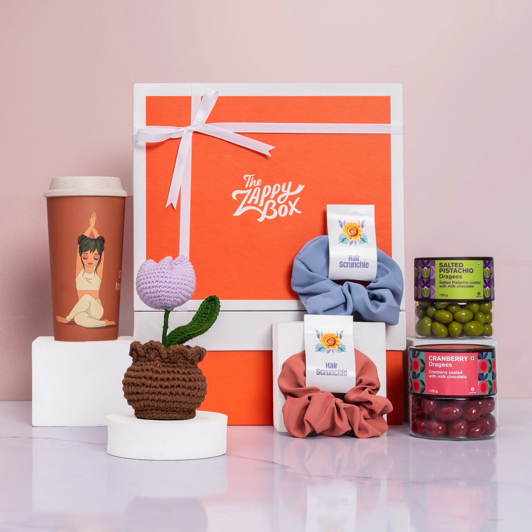 Encourage relaxation and self-care with the "Peace Mode On" gift hamper from The Zappy Box, thoughtfully curated for Women’s Day celebrations. This hamper includes a pair of satin scrunchies in assorted colors, a stylish 475 ml yoga sipper to keep hydrated, and a charming crochet tulip pot perfect for adding a touch of greenery to any space.