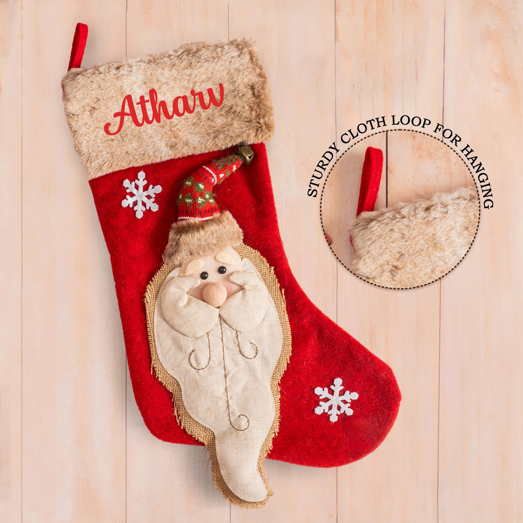 Add our beautiful and charming Red Santa Claus Stocking to your Christmas stocking decoration this festive season. The 3D Santa Claus design of this Personalized Christmas stocking makes it a perfect pick for Christmas. The vibrant red background adds to the visual appeal of this Christmas stocking, along with the little snowflakes.