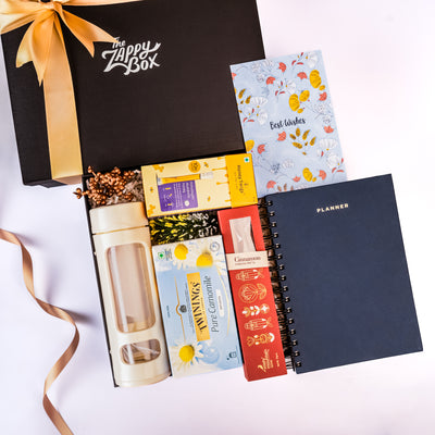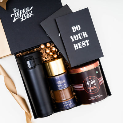 This motivation hamper also has TGL Co. Euphoria Instant Coffee to always keep the Josh high. We have also added 4700 BC Nutty Tuxedo Chocolate Gourmet Popcorns in this corporate hamper as a gourmet treat. What makes this corporate hamper super special is the fact that you can add a greeting card of your choice to convey your feelings. All this goodness is packed in a Reusable Zappy Gift Box that is sleek and eco-friendly.