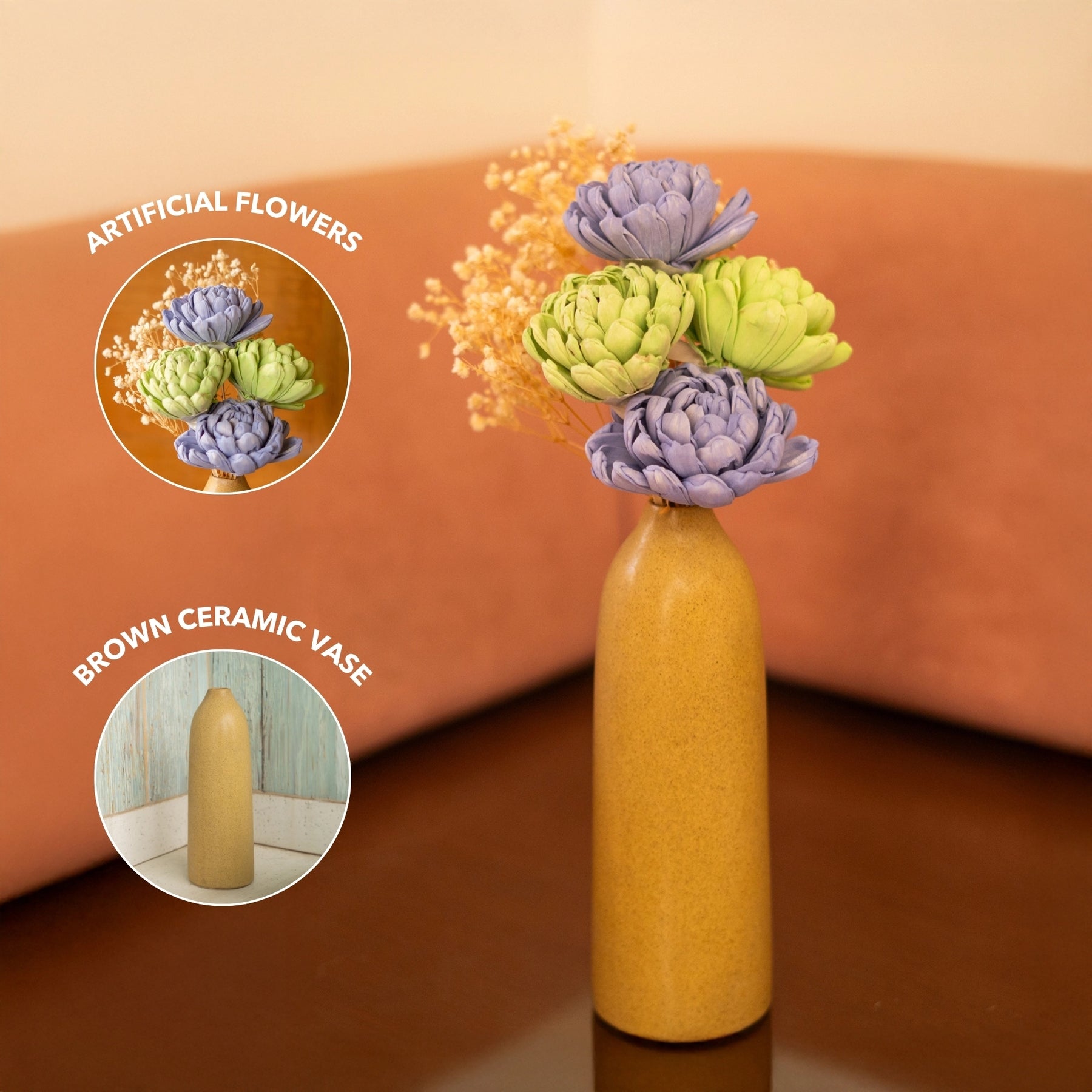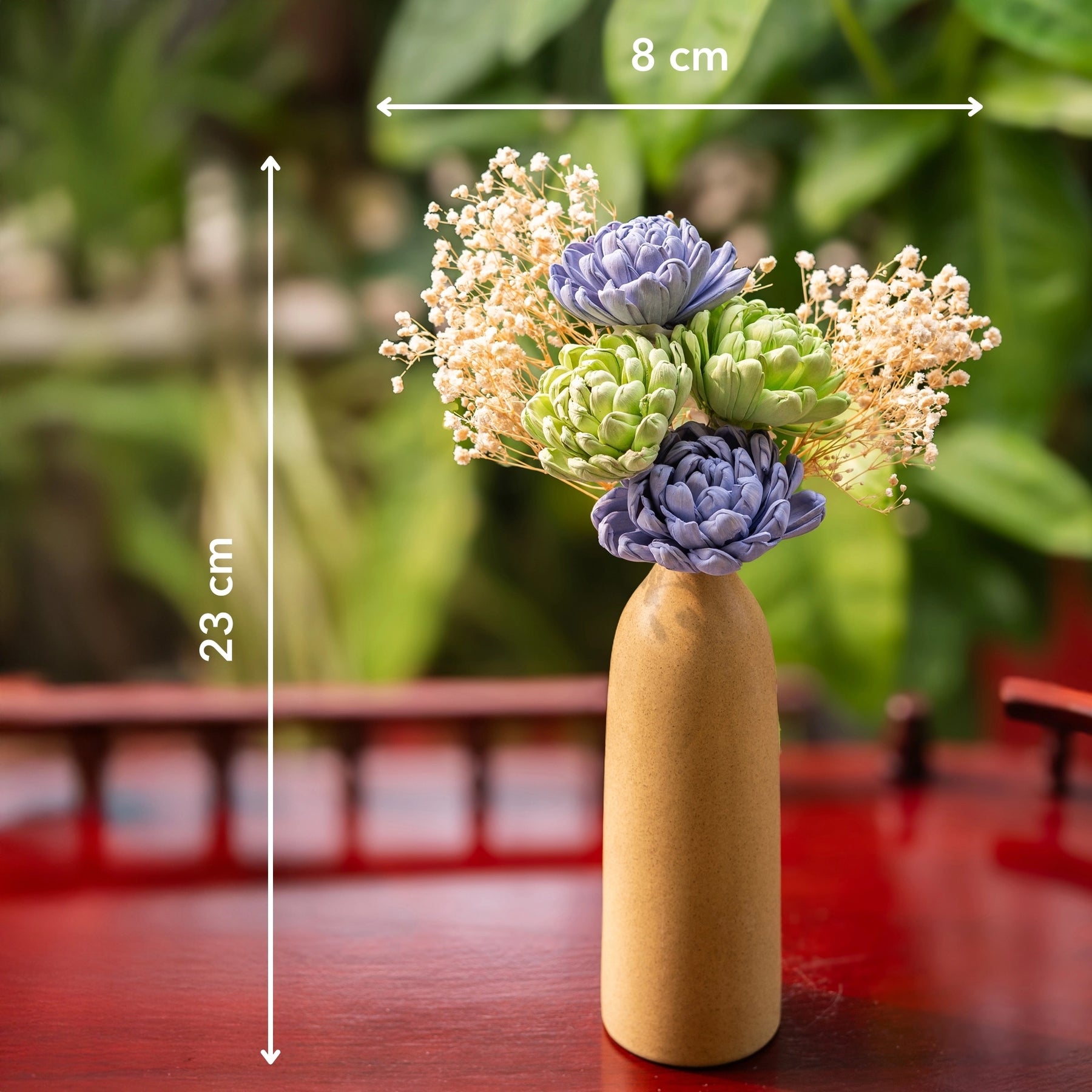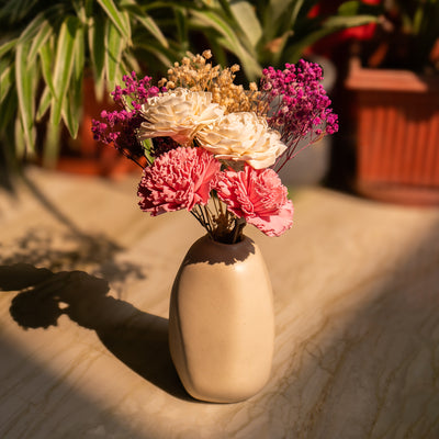 Choose a gift that's both functional and beautiful for your loved ones, just like our Rustic Charm Flower & Vase Combo. After all, a combo of timeless artificial flowers in a vase is all you need to make any space look more lively! The sustainable and durable base is made with high-quality ceramic, making it long-lasting. This beige-colored ceramic flower vase will blend in perfectly in a neutral-color home decor scheme. The eye-pleasing combination of blue and green artificial flowers adorns the ceramic vase. The baby’s breaths add to the overall look and feel of this home decor gift.