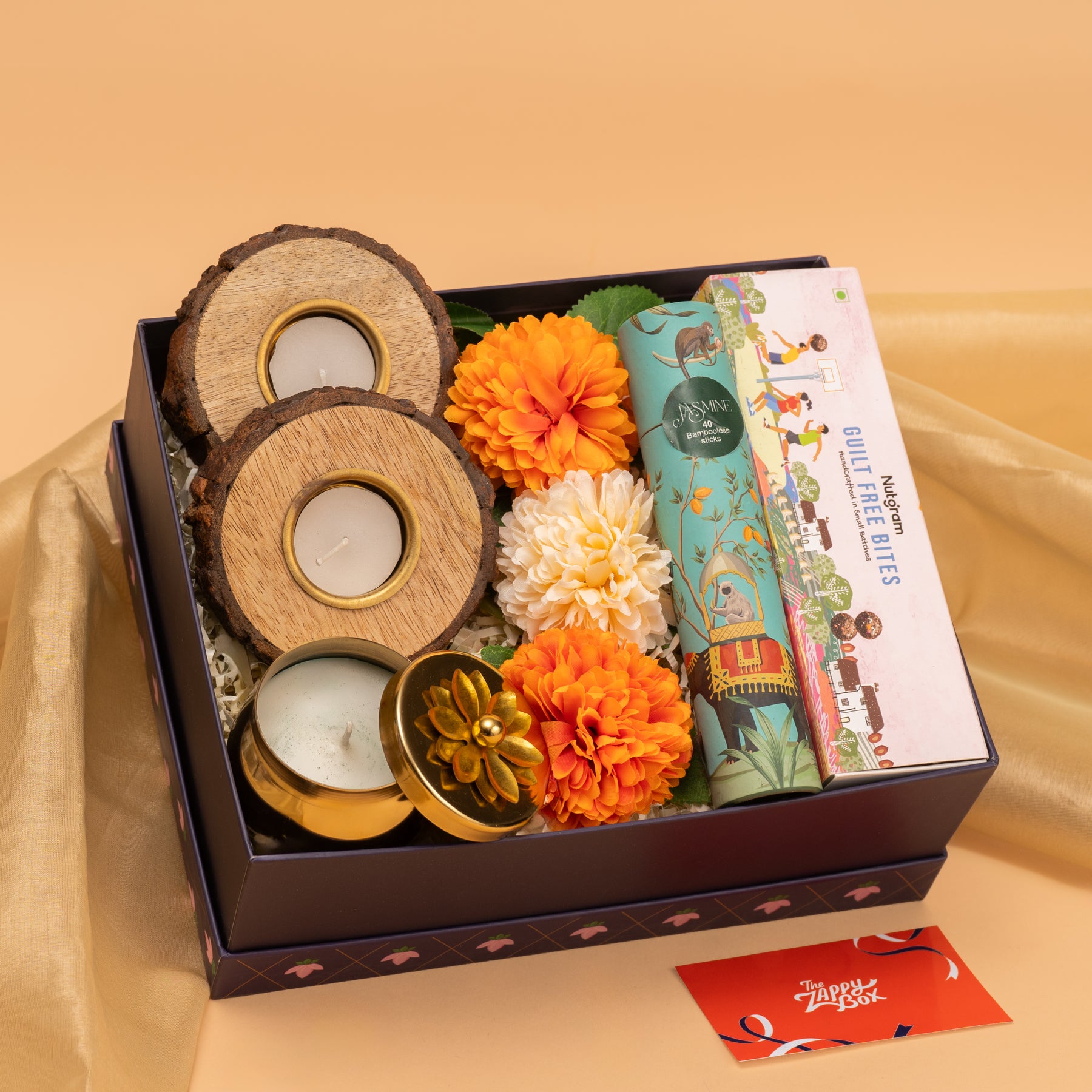 Illuminate your festive moments with the Sacred Light Box, a soulful Diwali gift hamper designed to bring peace, light, and positivity into every space. Curated with spiritual elegance, this box includes traditional Indian elements like a wooden brass t-light holder, natural incense sticks, and other items, creating the perfect ambiance for Diwali puja or serene home rituals. Ideal for gifting to parents, elders, spiritual friends, or colleagues, this hamper is a reflection of India’s festive heritage wrapped in contemporary aesthetics. Each item complements the others, making it a complete festive gift experience. The premium quality contents and thoughtful packaging ensure a lasting impression and add charm to any corner of your home.