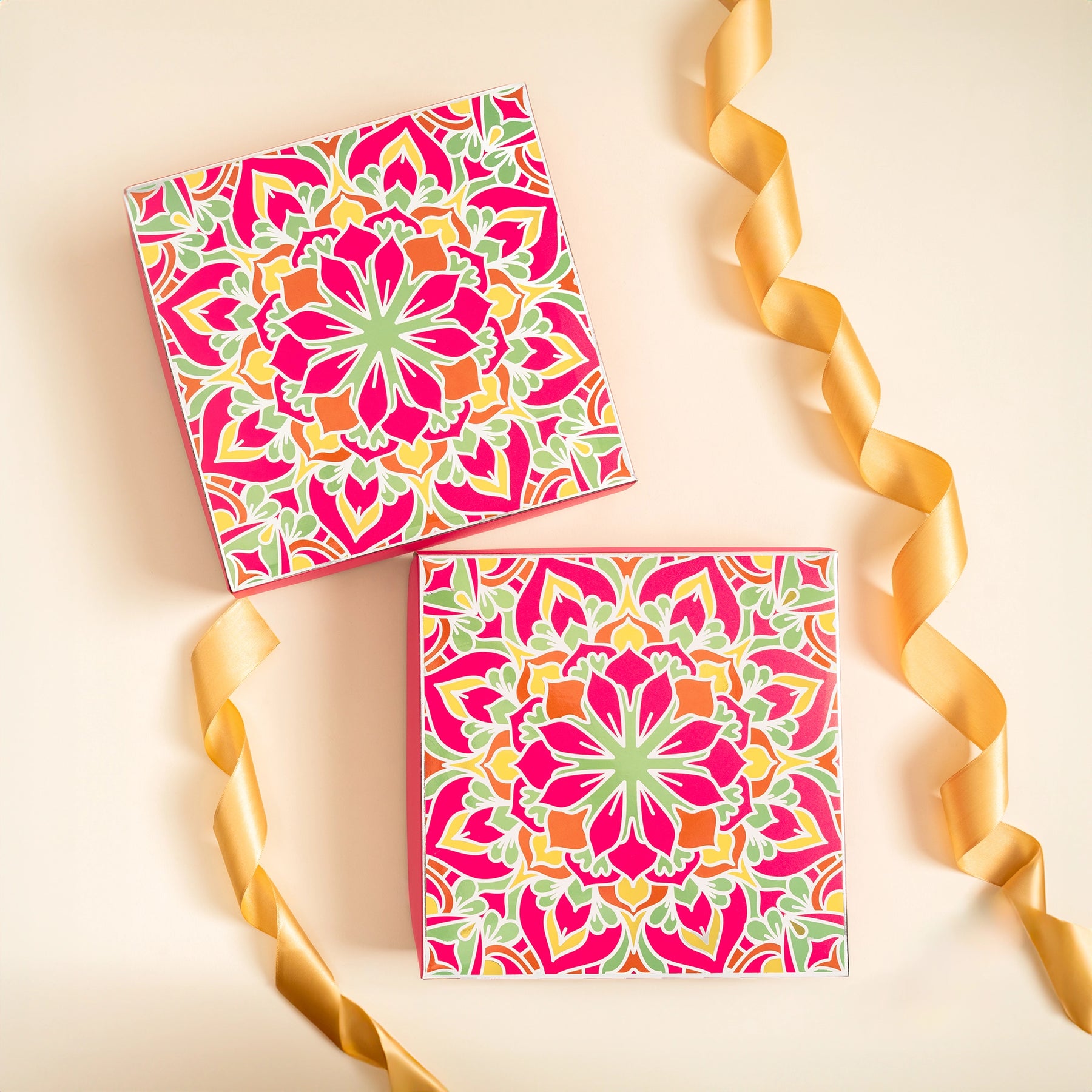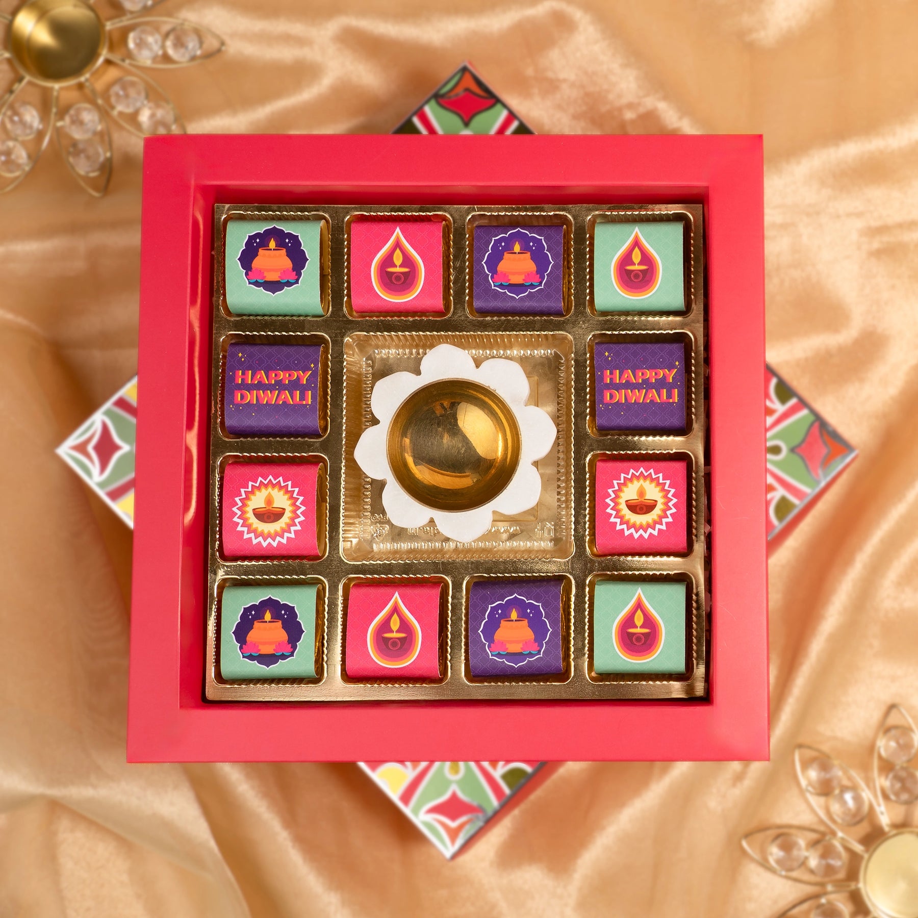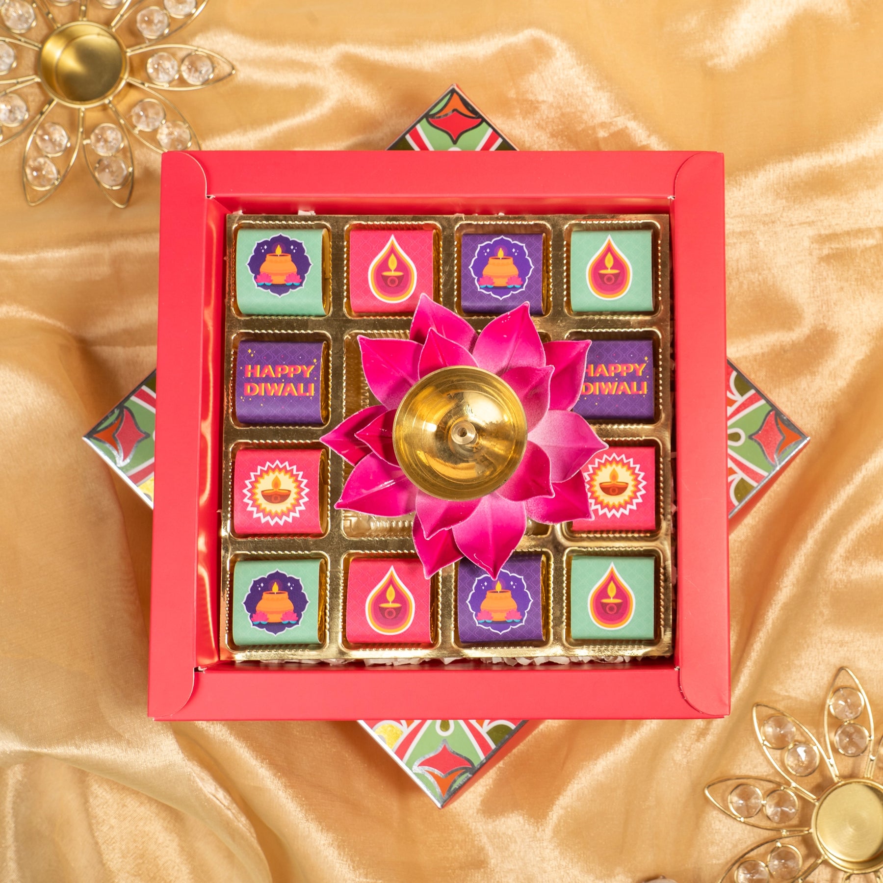 The Serenity Light Hamper from The Zappy Box is a soothing and premium gift box designed to bring calm and glow to your gifting moments. You can either opt for the pink brass diya or the white marble one. The pink brass diya is a sacred oil lamp crafted from brass, revered for its spiritual symbolism and ability to purify the environment, dispelling negativity and inviting divine blessings. Its warm, flickering light represents hope, wisdom, and the triumph of light over darkness, making it integral to poojas and festive celebrations. The white marble diya, handcrafted from premium Makrana marble with a polished brass bowl, combines timeless elegance with functionality. The marble base provides stability, while the brass bowl ensures safe and long-lasting illumination during rituals or decor, promoting serenity and purity in the space. These gourmet chocolates add a touch of indulgence, perfectly complementing the calming vibe of the diya and enhancing the luxurious gifting experience.