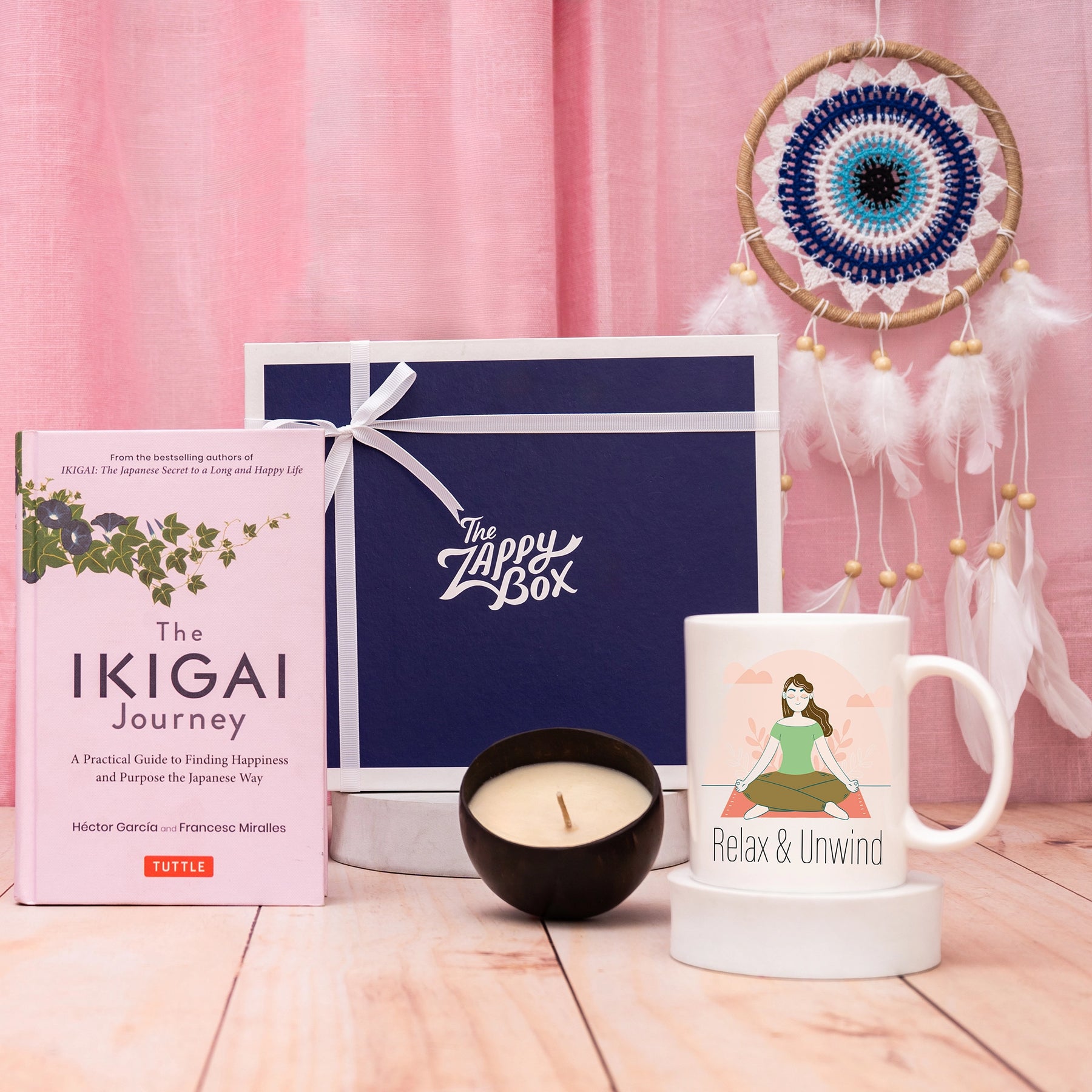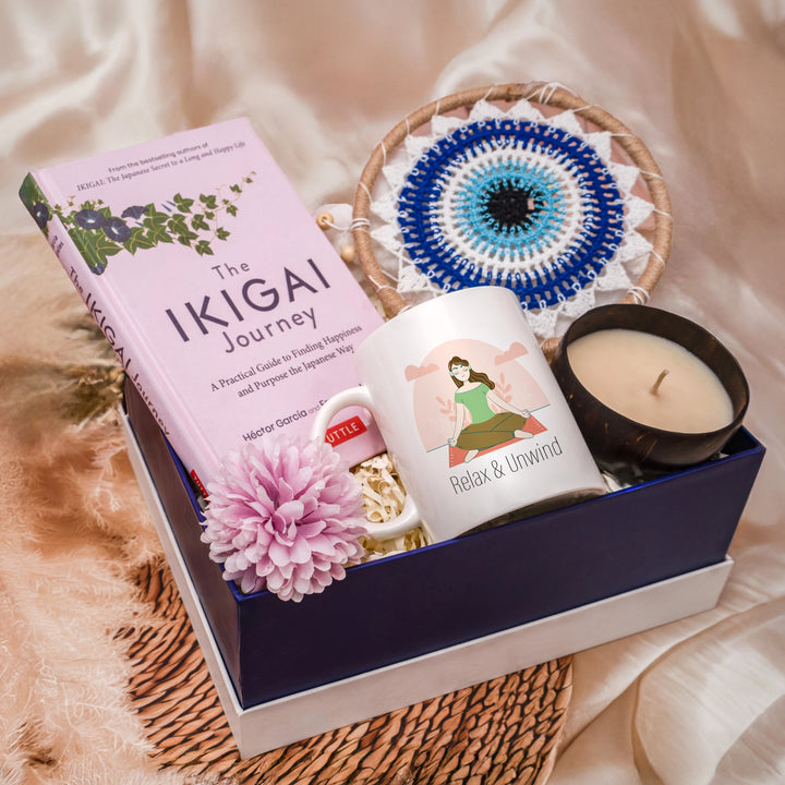 Transform moments into mindful rituals with the Soulful Retreat Wellness Gift Hamper, a thoughtfully curated experience built to soothe the soul. Nestled in a reusable Zappy gift box, this hamper includes the inspiring IKIGAI book, an Evil Eye dreamcatcher to promote positive energy, a 350 ml Relax & Unwind ceramic mug, and an eco-friendly coconut shell candle, plus a greeting card customized to your sentiment.