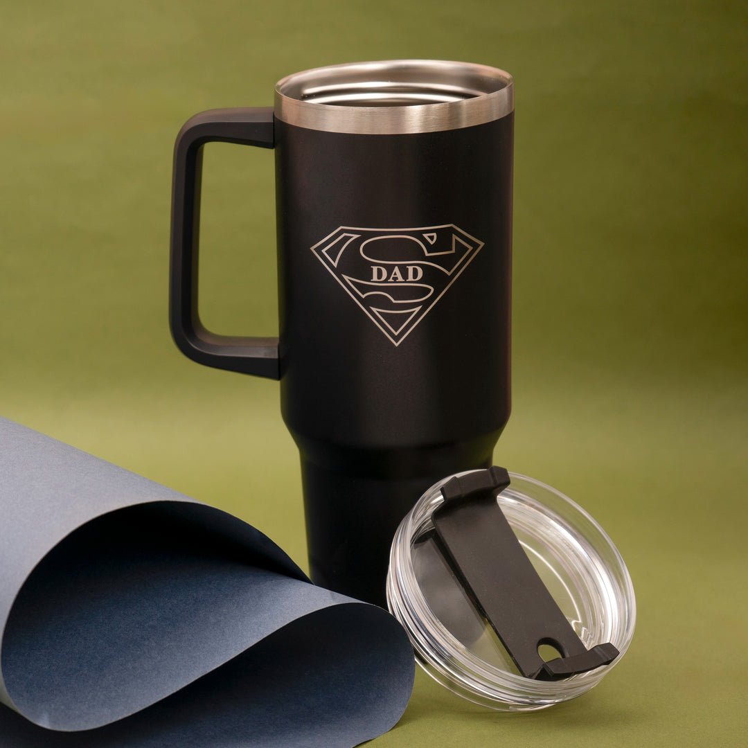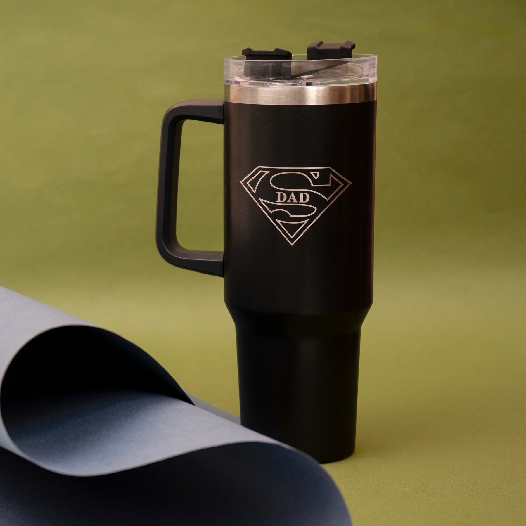 Celebrate your superhero with our super dad personalized stainless steel tumbler—a perfect gift that says you are the best with every sip. This customized tumbler comes with a capacity of 1200 ml and is designed to show appreciation to our first superhero. We offer two design variants of personalized tumblers: a super dad quote with superman logo or a fun super dad with stars. Designed in a bold matte black finish, this stainless steel tumbler comes with a lid and straw. It is perfect to keep your drinks at the right temperature while adding a splash of personality. The wide-open mouth design comes with a leak-proof lid and straw slot for easy usage.