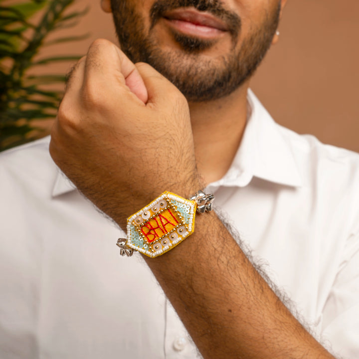 The Threaded Soulmates Lumba Rakhi Set comes in a traditional artisanal style. It falls under the category of wrist accessory. The design represents a beautifully coordinated Rakhi and Lumba set featuring intricate threadwork, festive accents, and handcrafted finesse perfect for honoring Bhaiya-Bhabhi bonds. It is ideal for gifting on Raksha Bandhan for couples who appreciate tradition and handcrafted beauty. To increase longevity, we recommend storing it in a dry place; avoid water and rough handling. Additionally, it is a gracefully designed Rakhi-Lumba pair that blends timeless culture with delicate detailing, ideal for meaningful celebrations.