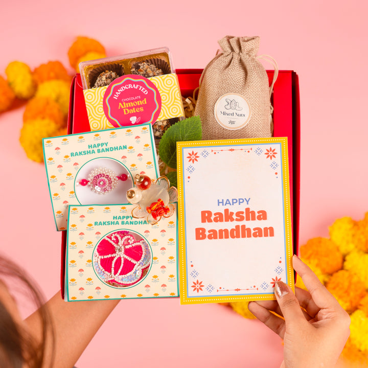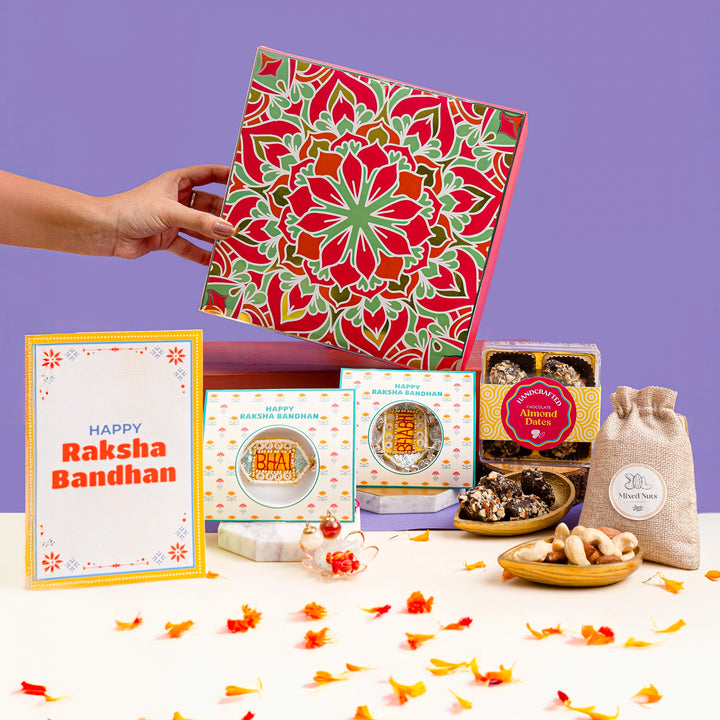 Enjoy the celebration more with premium sweets, which make the Rakhi with Gifts for Bhaiya Bhabhi even more fun. The hamper also stands out as one of the best customizable Rakhi Hampers, allowing you to add a personal touch for your loved ones. It's a wonderful festive gift to share love and strengthen family ties with affection; this hamper stands out. Make the upcoming Raksha Bandhan a memorable occasion with The Zappy Box’s thoughtful presentation and traditional elegance.