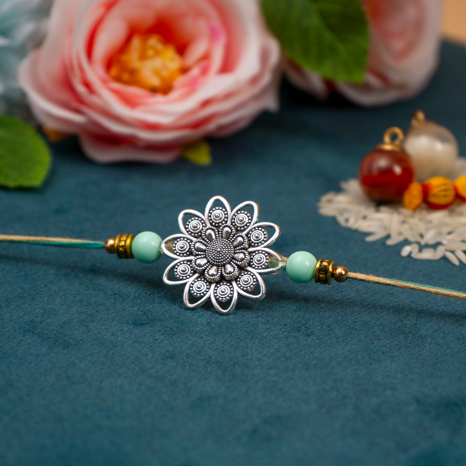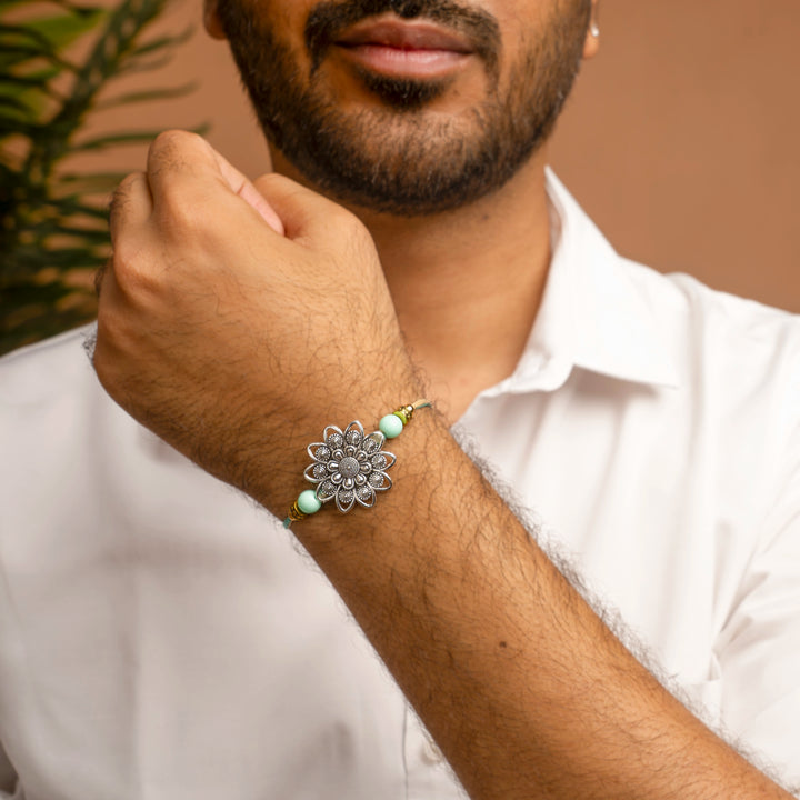 The Vintage Bloom Rakhi comes in a vintage and antique style. It falls under the category of wrist accessory. The design represents a delicate vintage-style floral rakhi with intricate flower designs and pastel tones that celebrates sisterly affection with grace. It is ideal for gifting on Raksha Bandhan, especially for sisters, cousins, or younger siblings. To increase longevity, we recommend keeping it dry, avoiding perfume, water, and rough use. Additionally, it features a lightweight, handcrafted rakhi with a vintage bloom charm, a perfect blend of nostalgia and elegance.