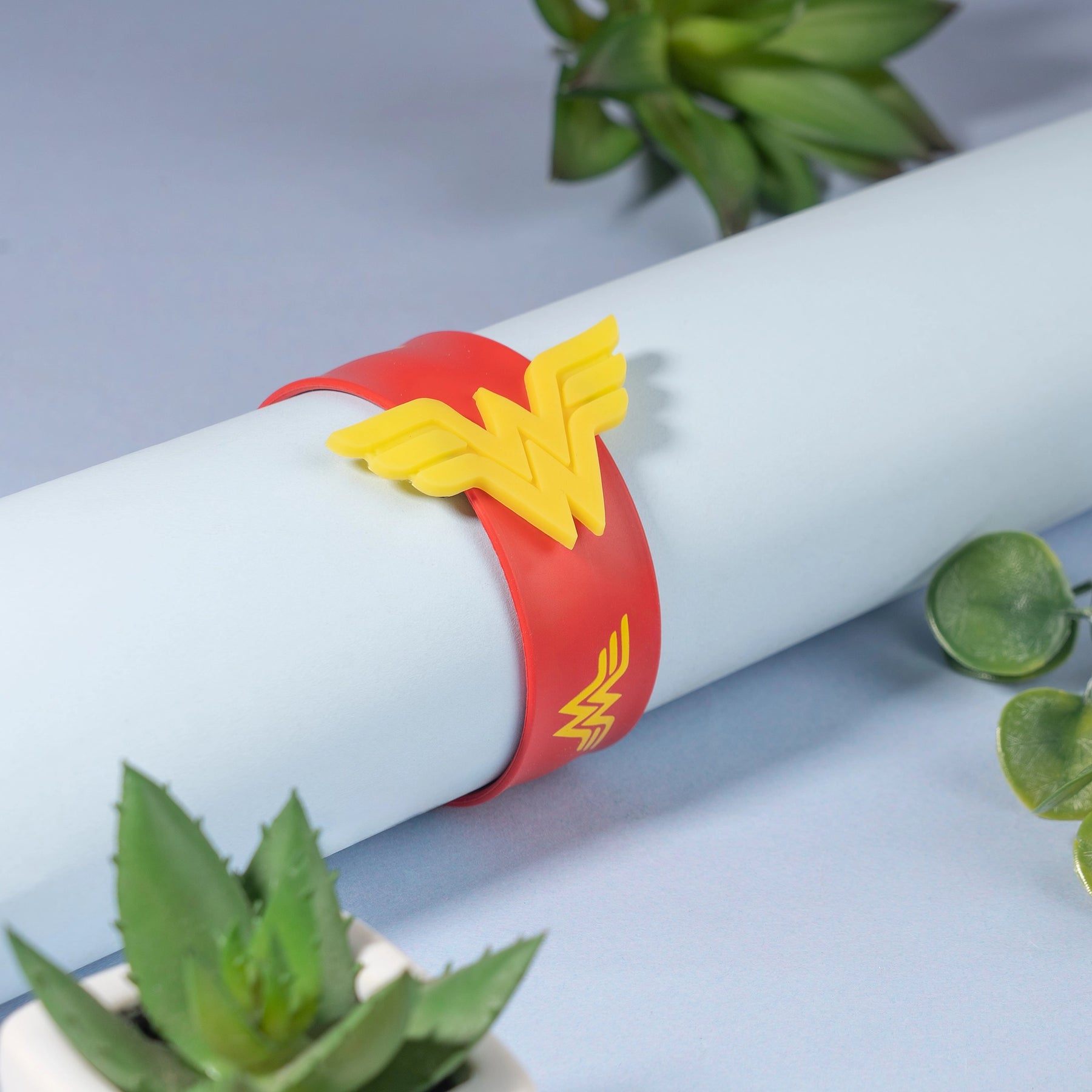 Celebrate your sister’s strength and spirit with the Wonder Woman Slap Band Rakhi, a vibrant, playful twist on the traditional rakhi band. Designed to channel the power and confidence of Wonder Woman, this rakhi features the iconic symbol on a flexible, soft silicone slap band that wraps comfortably around the wrist in a single snap.
