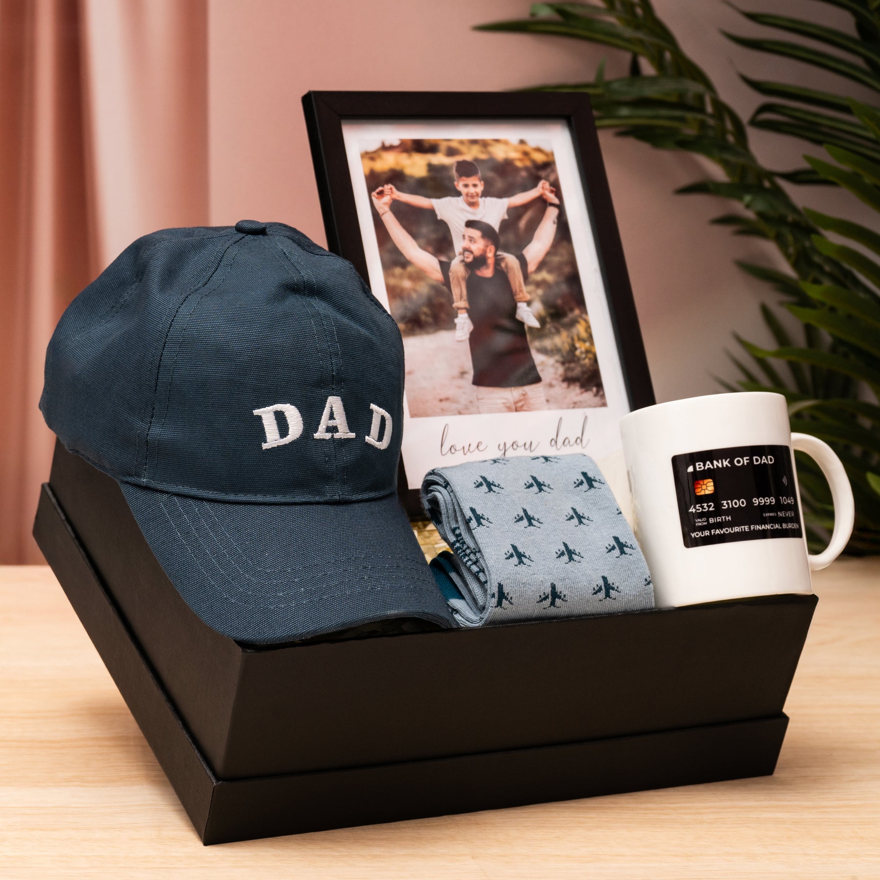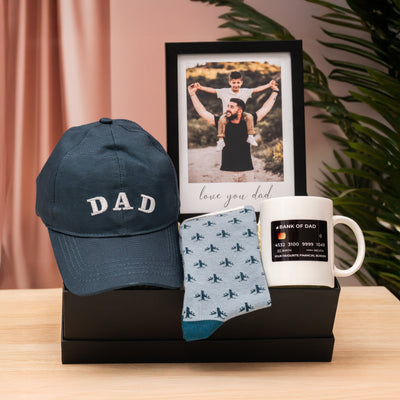 Firstly, this gift item for fathers has the stylish and comfortable embroidered "Dad" cap which is perfect for casual outings or just lounging at home. It's adjustable to ensure the perfect fit. It also includes Mint & Oak Fly Away Socks that feature a playful design and are made for ultimate comfort. What makes this gift even more special is a personalized greeting card that lets you express your love towards your father in heartfelt words.